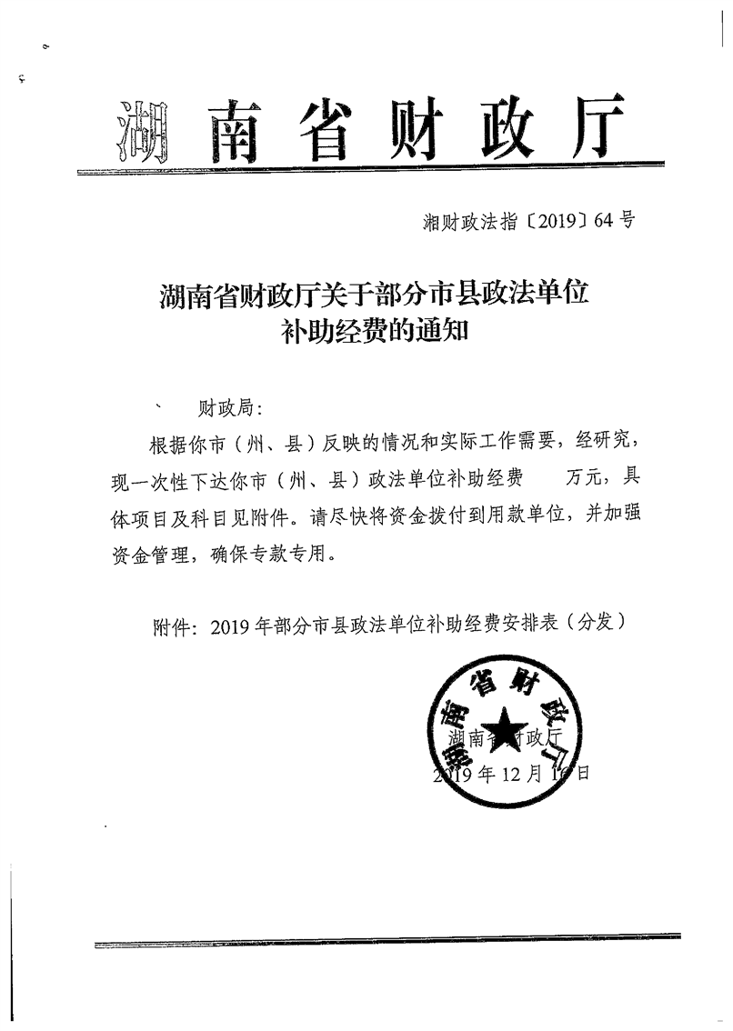 湖南省财政厅关于部分市县政法单位补助经费的通知