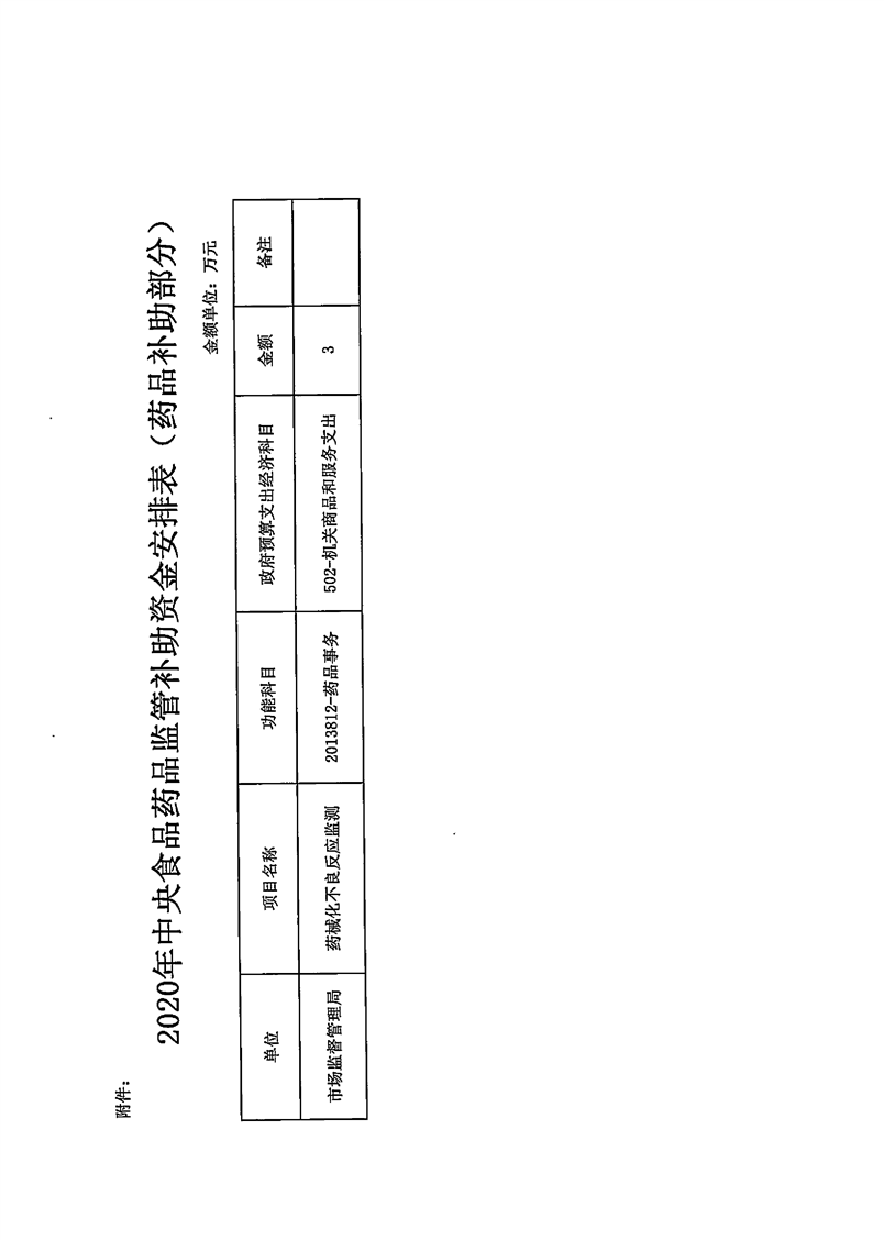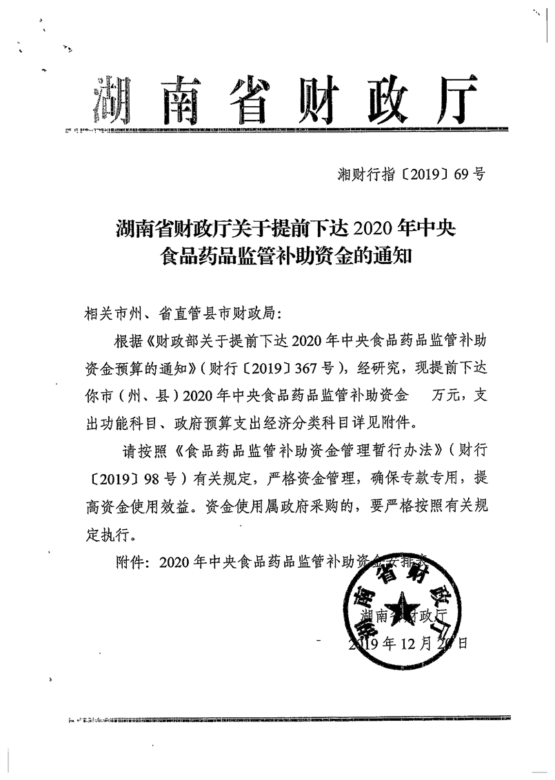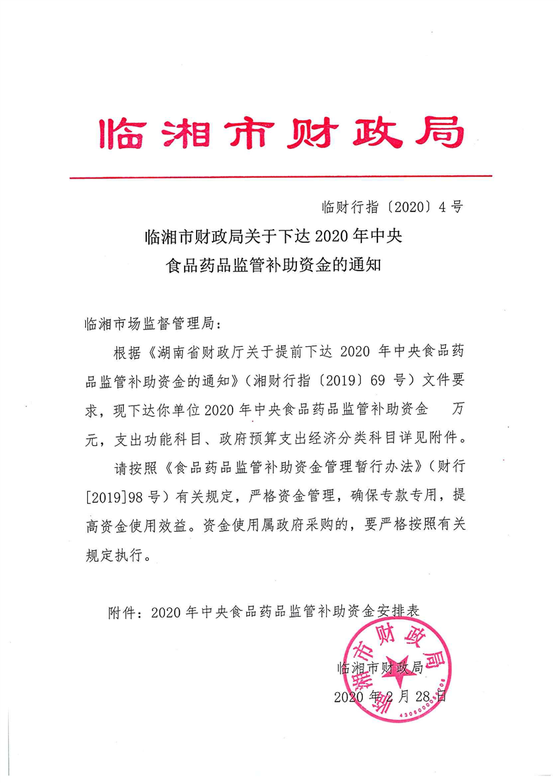 临湘市财政局关于下达2020年中央食品药品监管补助资金的通知