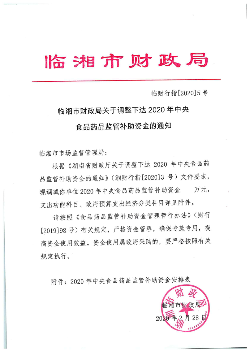 临湘市财政局关于调整下达2020年中央食品药品监管补助资金的通知