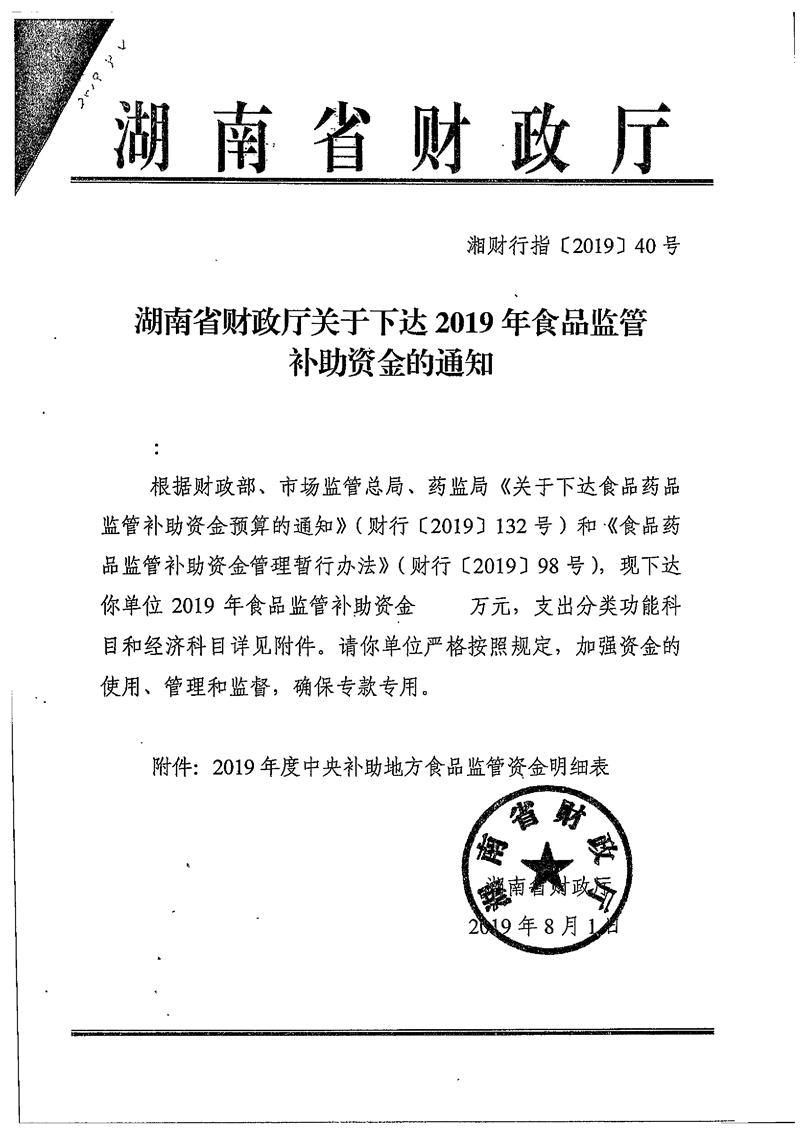 湖南省财政厅关于下达2019年食品监管补助资金的通知