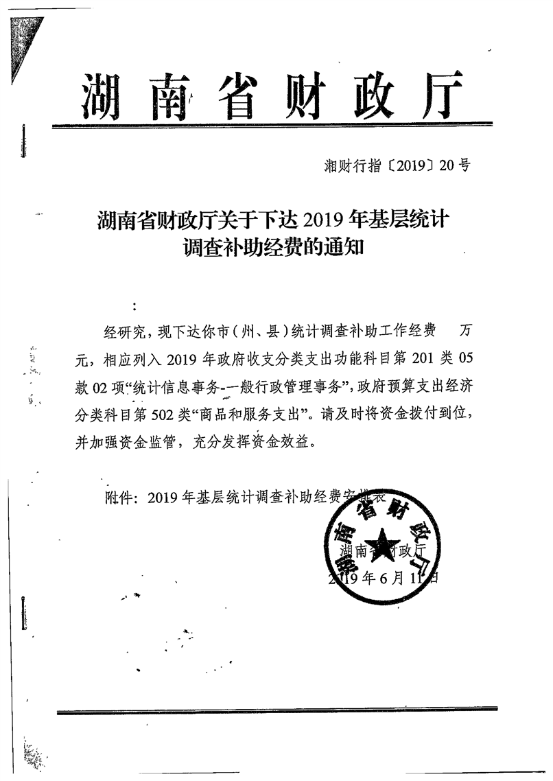 湖南省财政厅关于下达2019年基层统计调查补助经费的通知