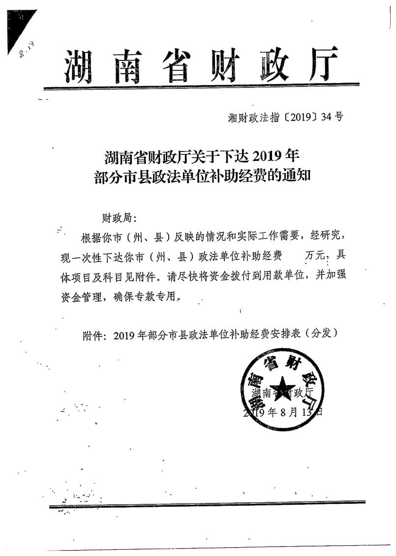 省财政厅关于下达2019年部分市县政法单位补助经费的通知
