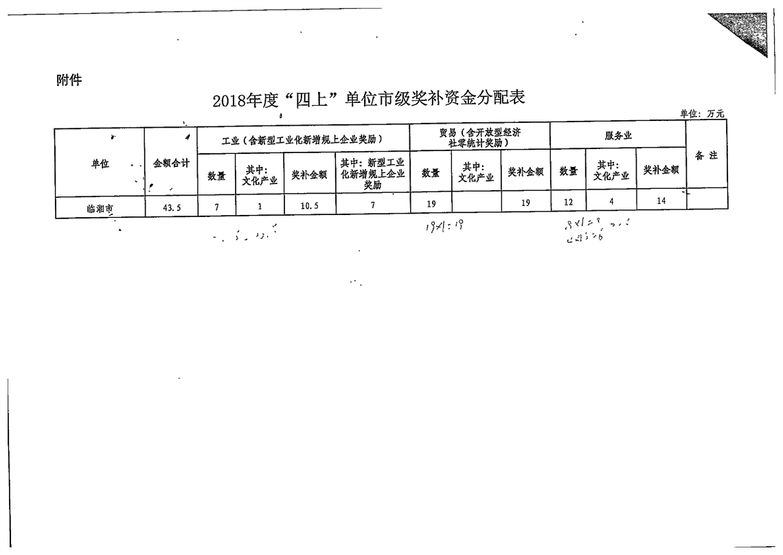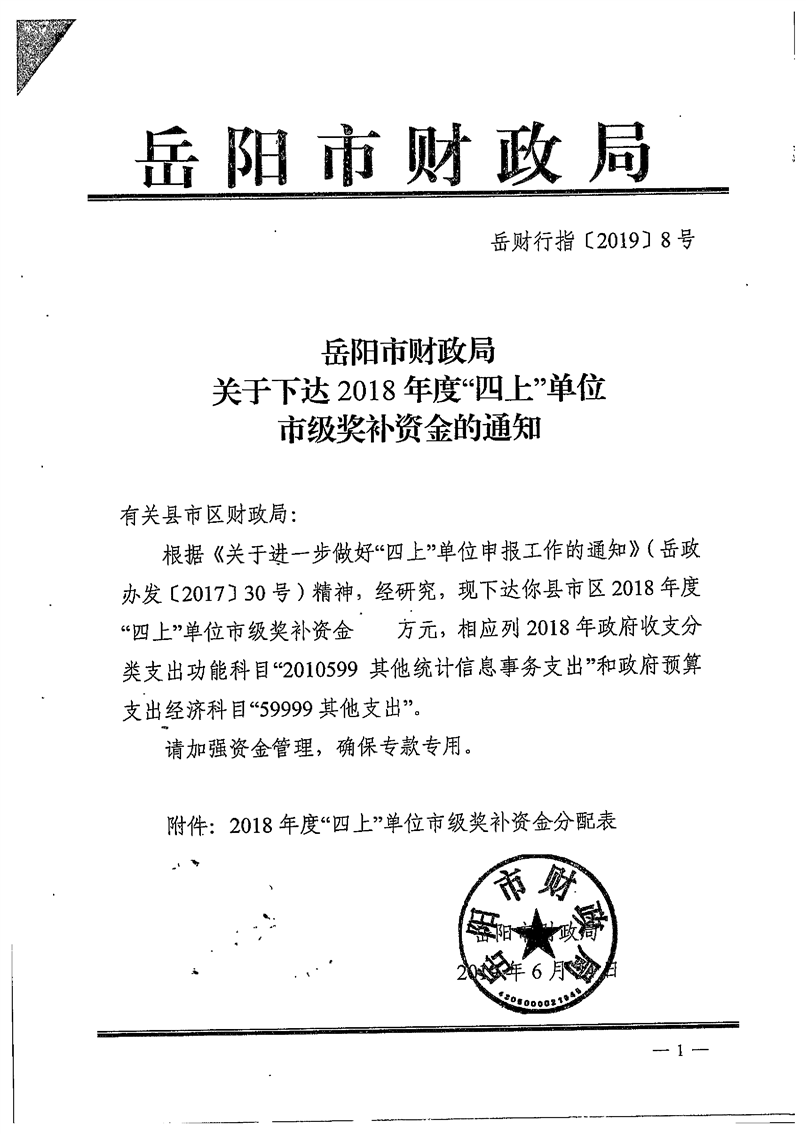 关于下达2018年度“四上”单位市级奖补资金的通知