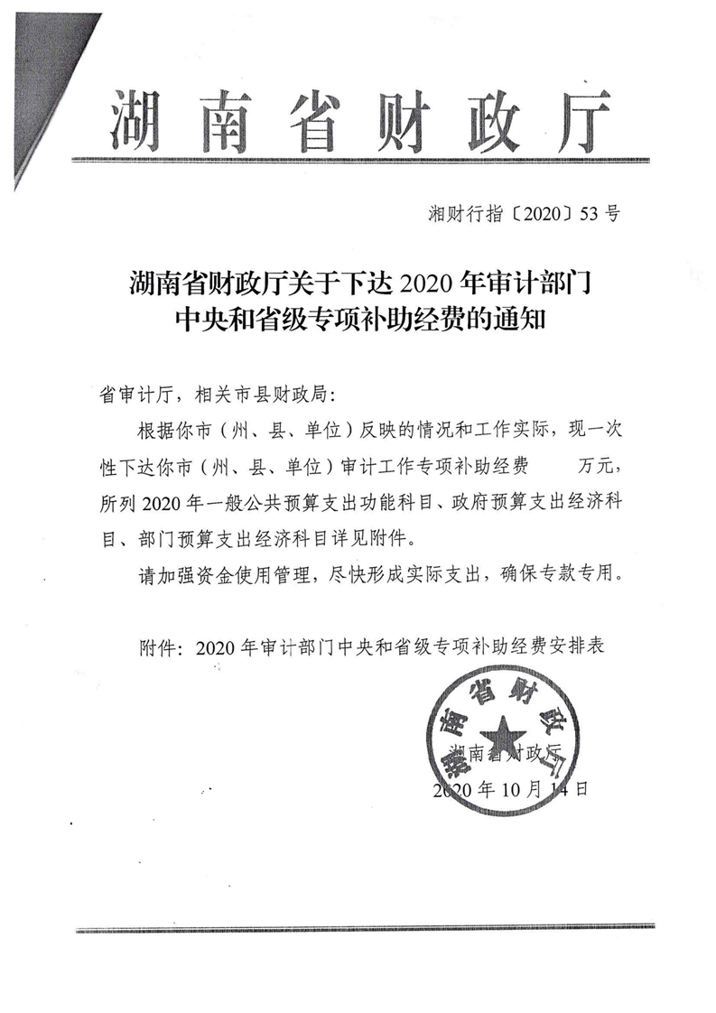 湖南省财政厅关于下达2020年审计部门中央和省级专项补助经费的通知