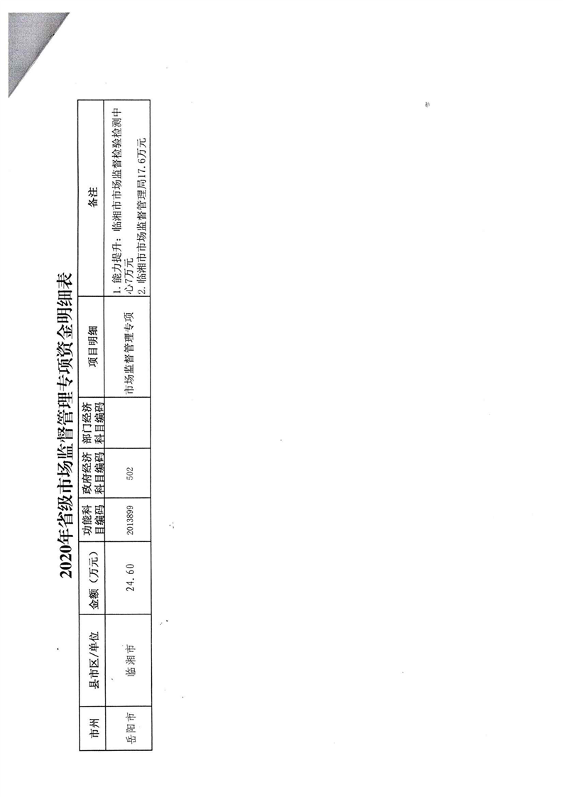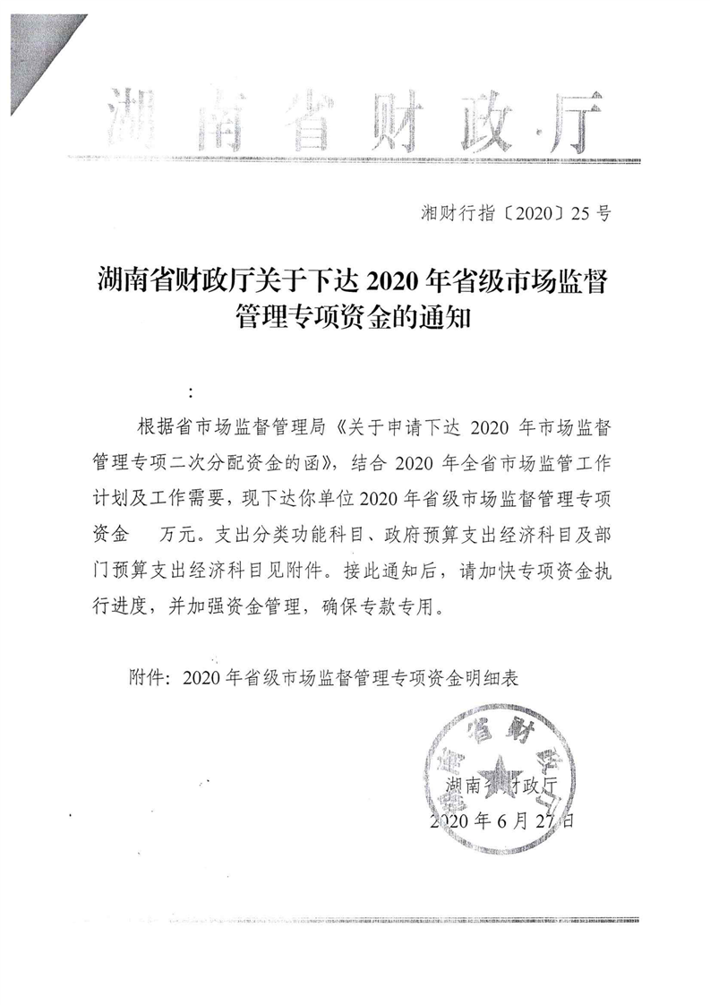 湖南省财政厅关于下达2020年省级市场监督管理专项资金的通知