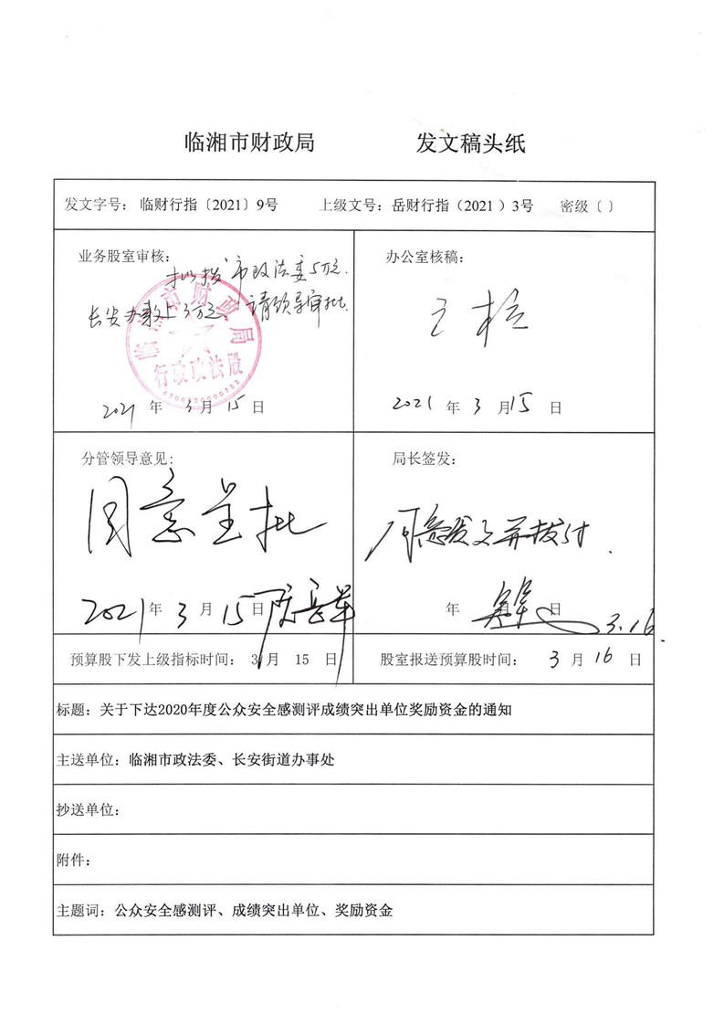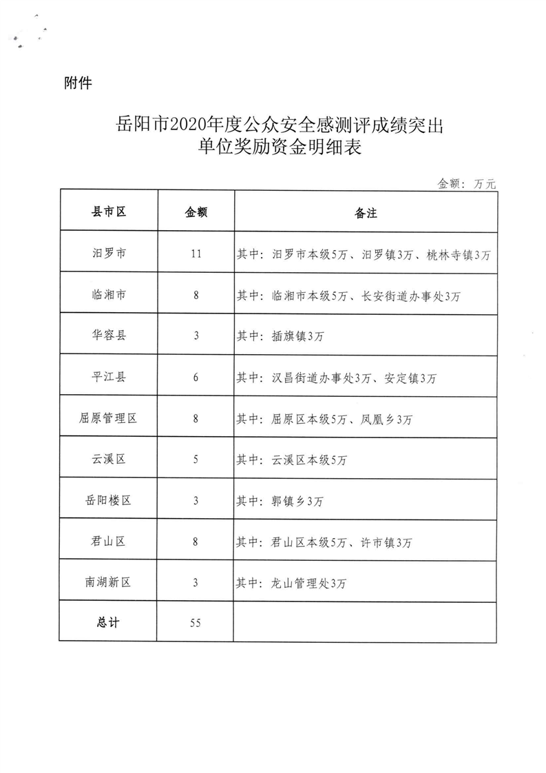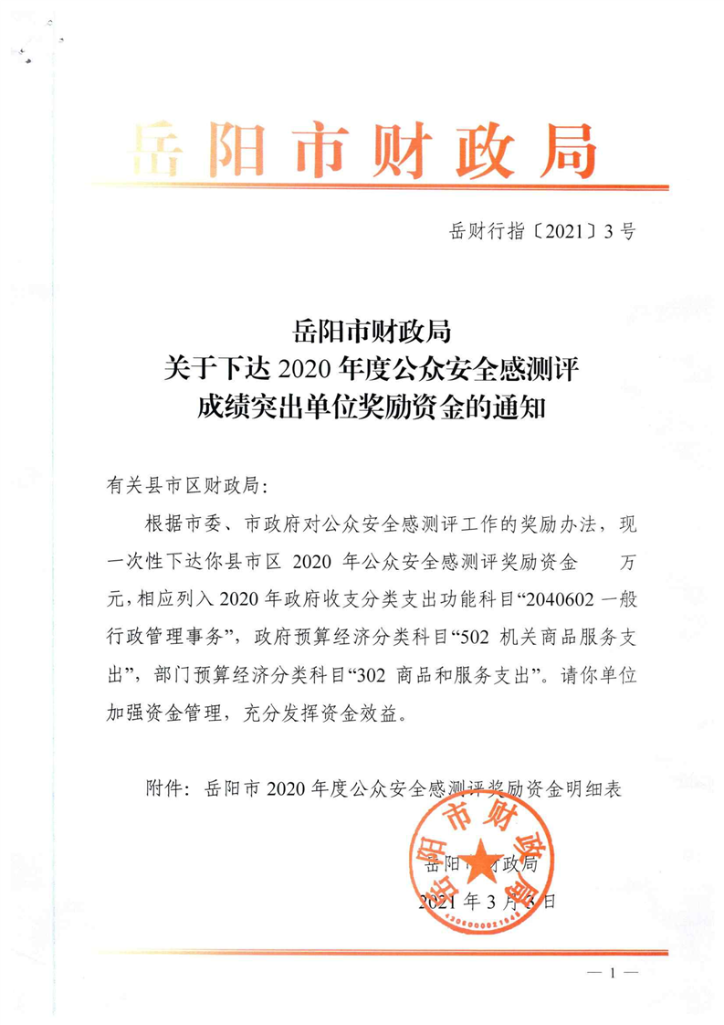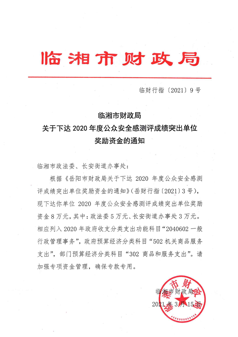 关于下达2020年度公众安全感测评成绩突出单位奖励资金的通知