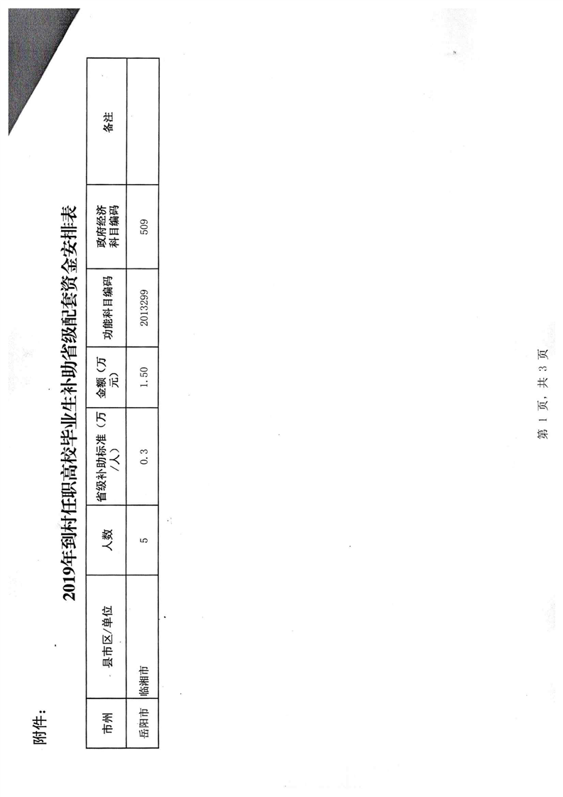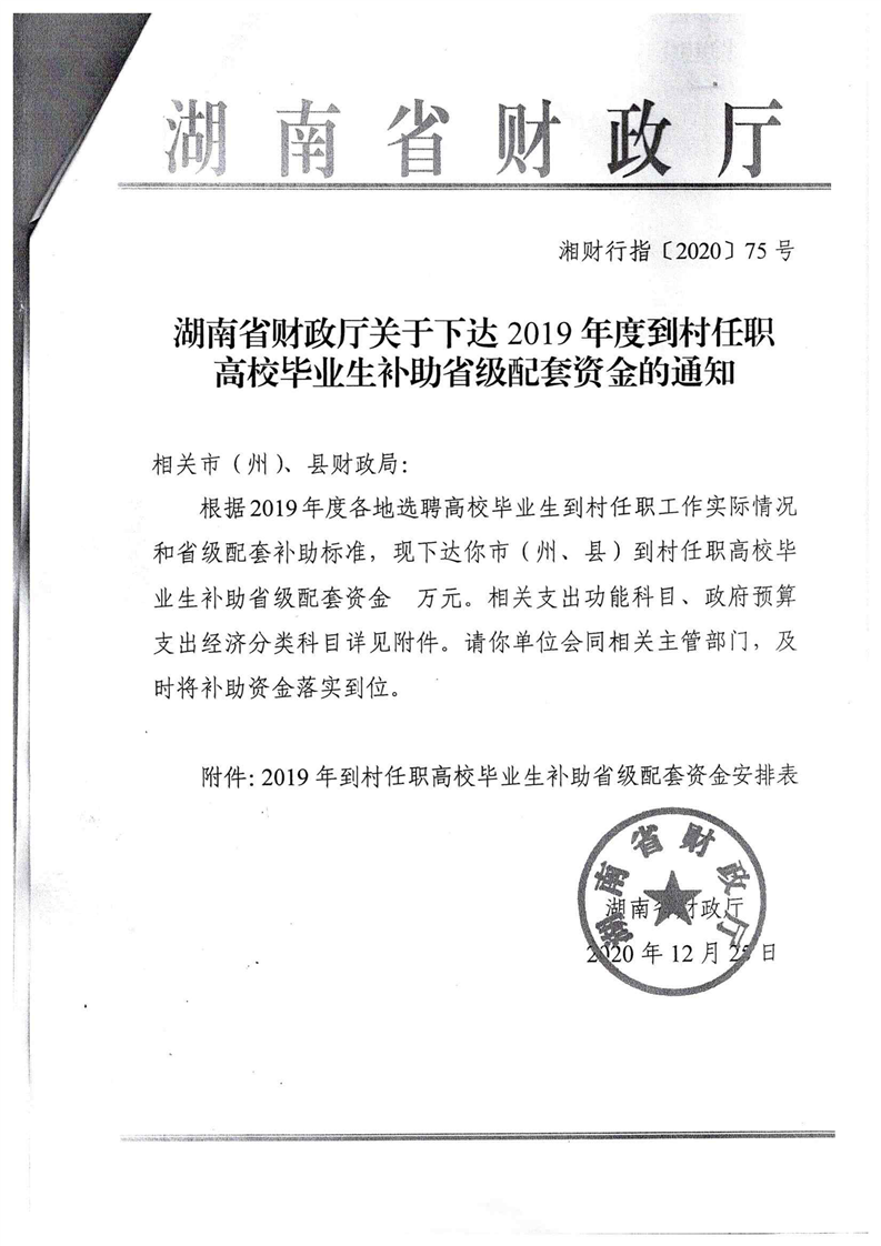 湖南省财政厅关于下达2019年度到村任职高校毕业生补助省级配套资金的通知