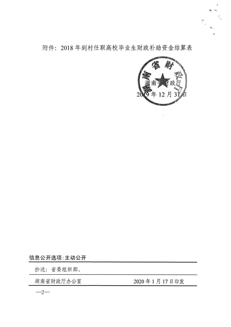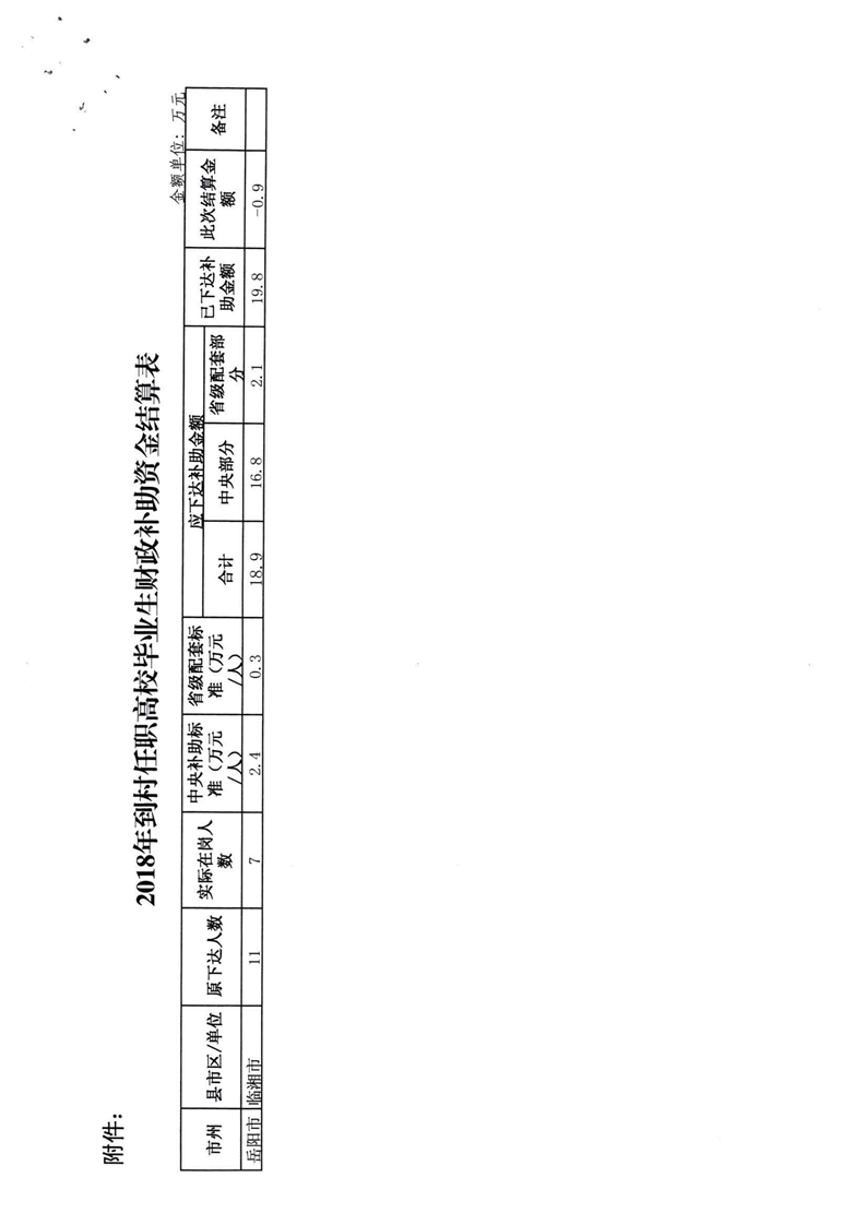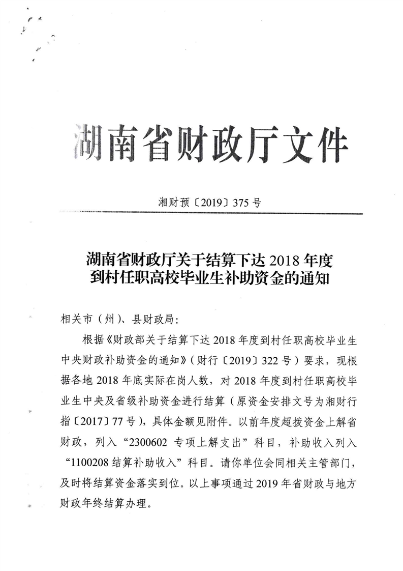 湖南省财政厅关于结算下达2018年度到村任职高校毕业生补助资金的通知