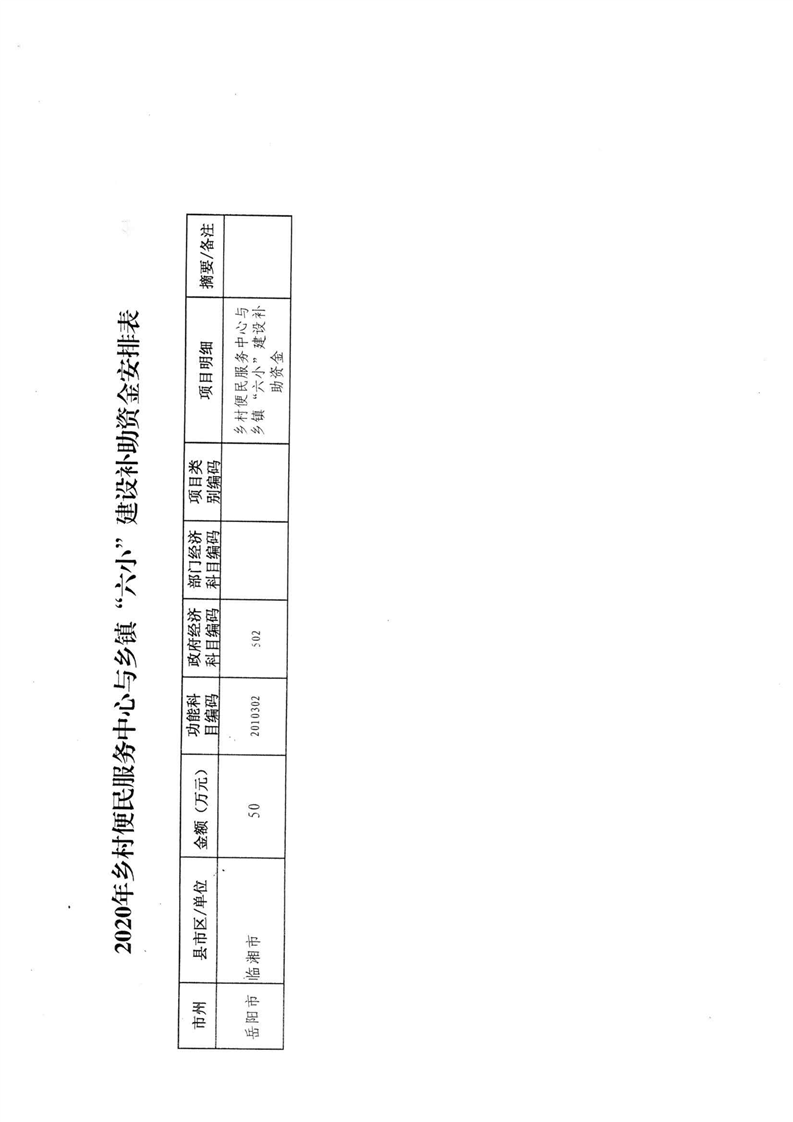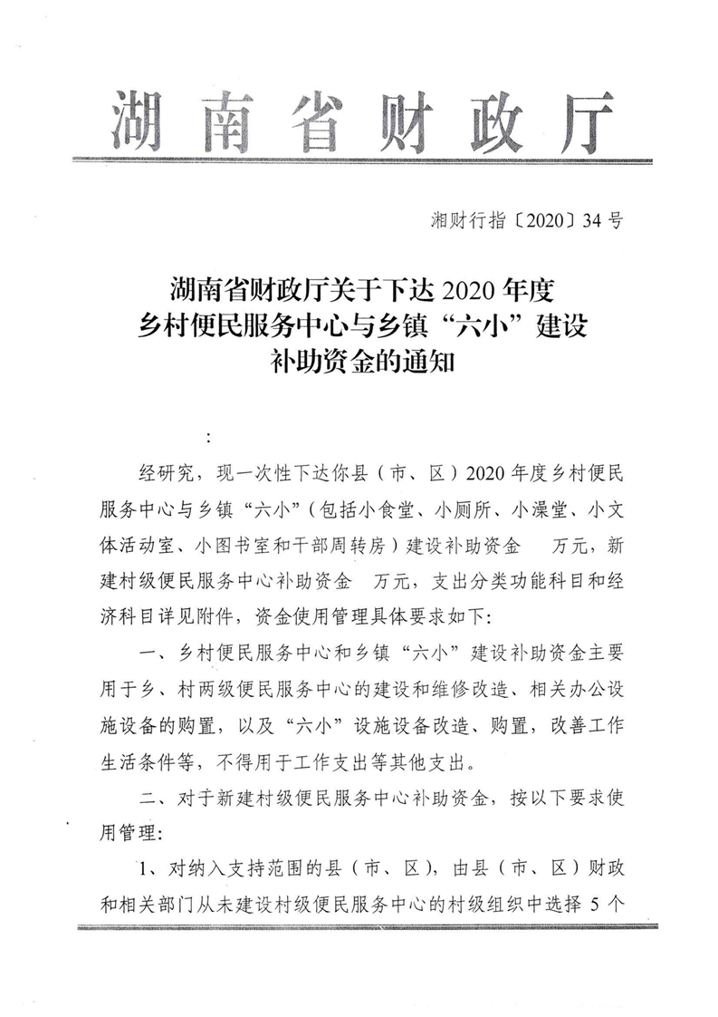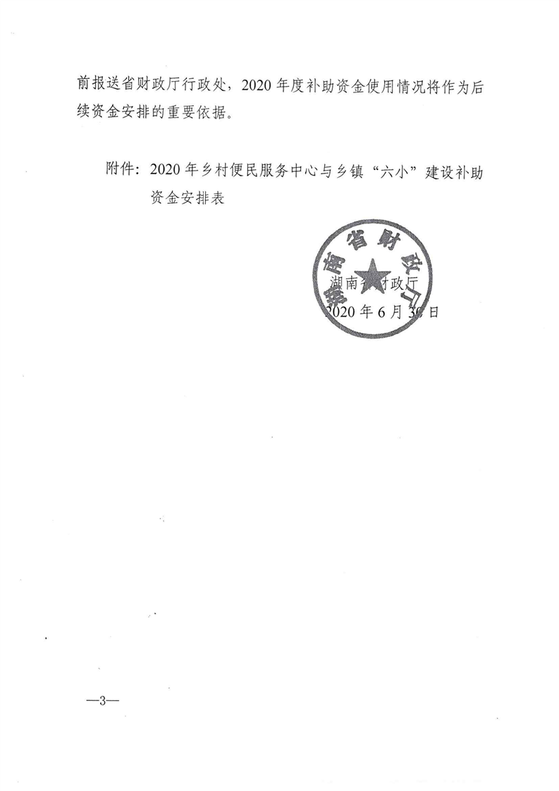 湖南省财政厅关于下达2020年度乡村便民服务中心与乡镇“六小”建设补助资金的通知
