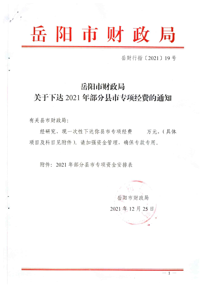 关于下达2021年部分县市专项经费的通知