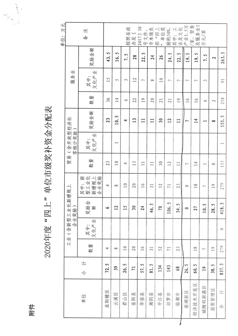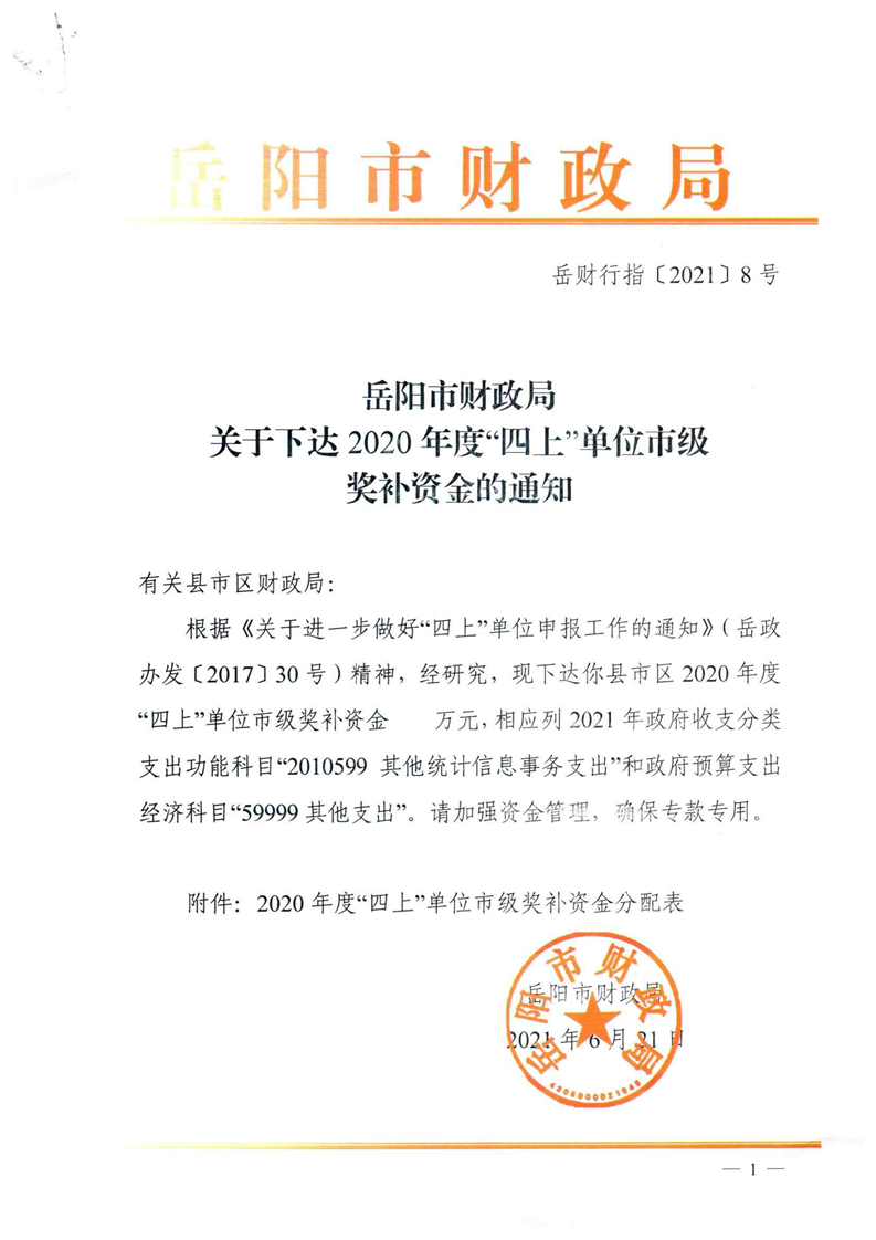 关于下达2020年度“四上”单位市级奖补资金的通知