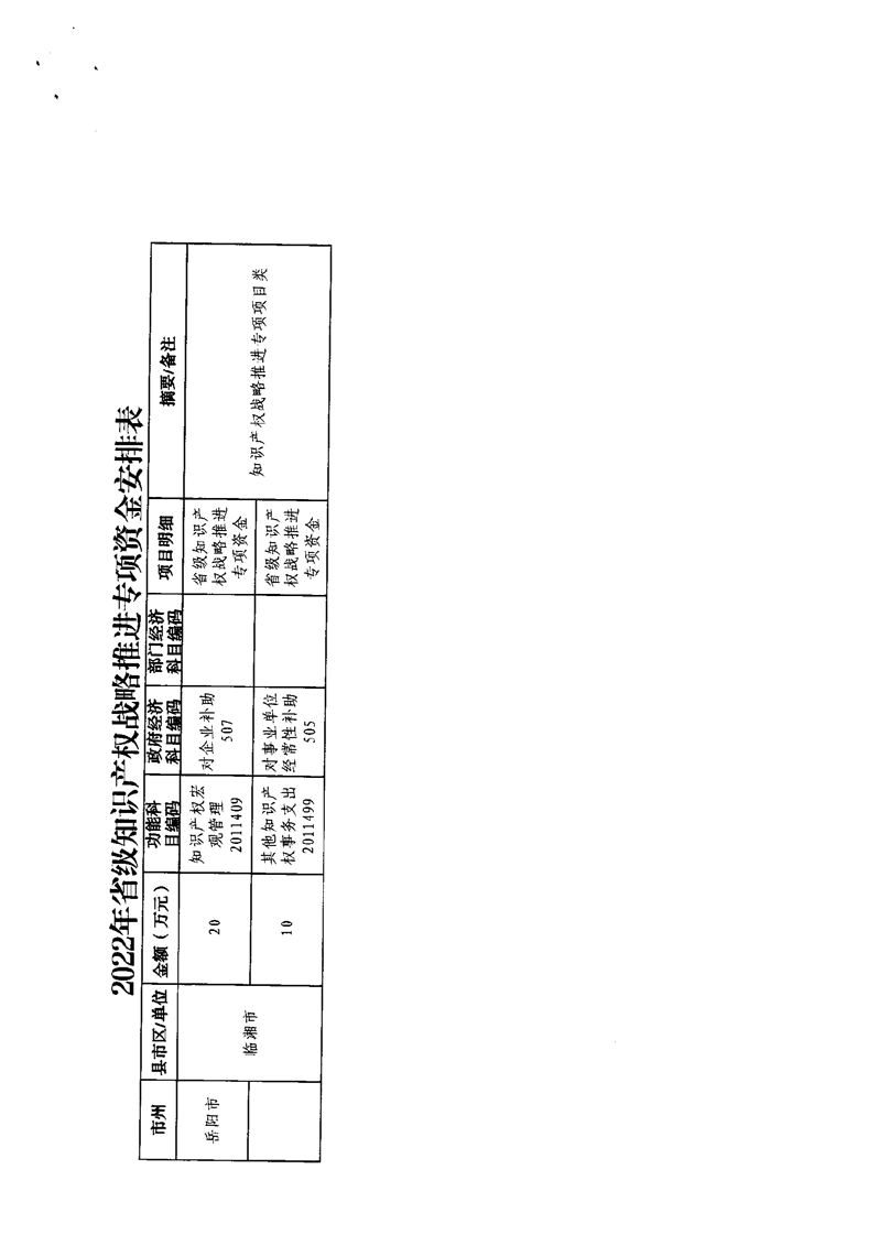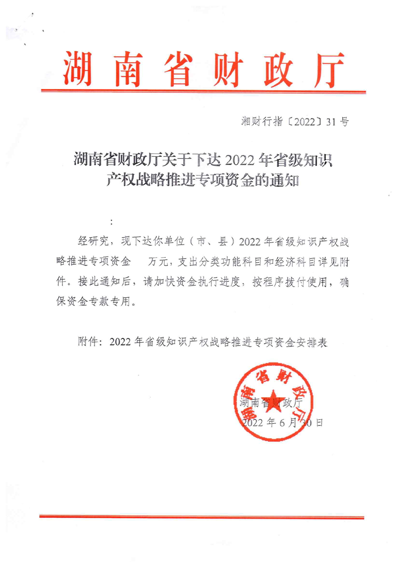 湖南省财政厅关于下达2022年省级知识产权战略推进专项资金的通知