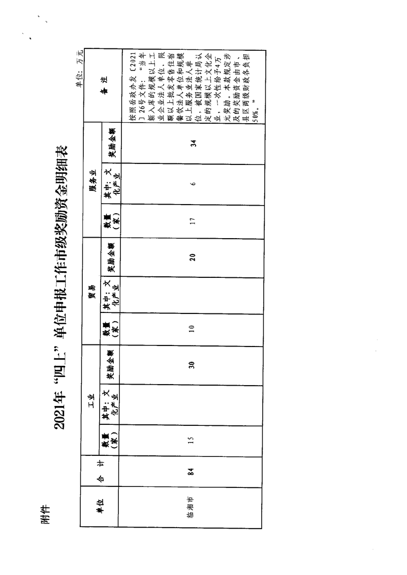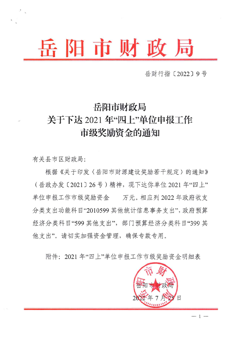 岳阳市财政局关于下达2021年“四上”单位申报工作市级奖励资金的通知