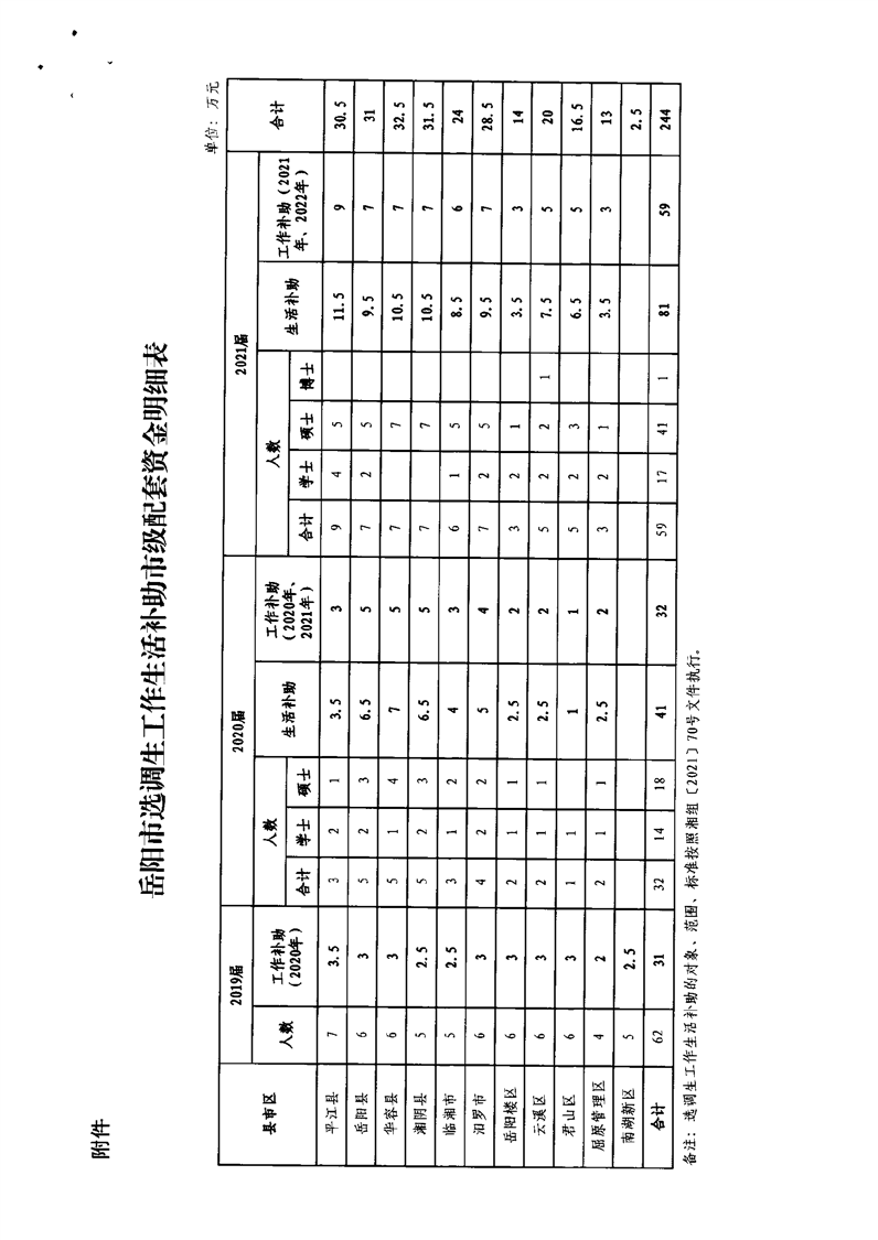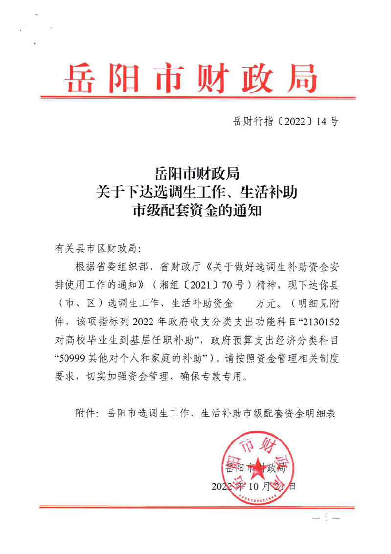 岳阳市财政局关于下达选调生工作、生活补助市级配套资金的通知
