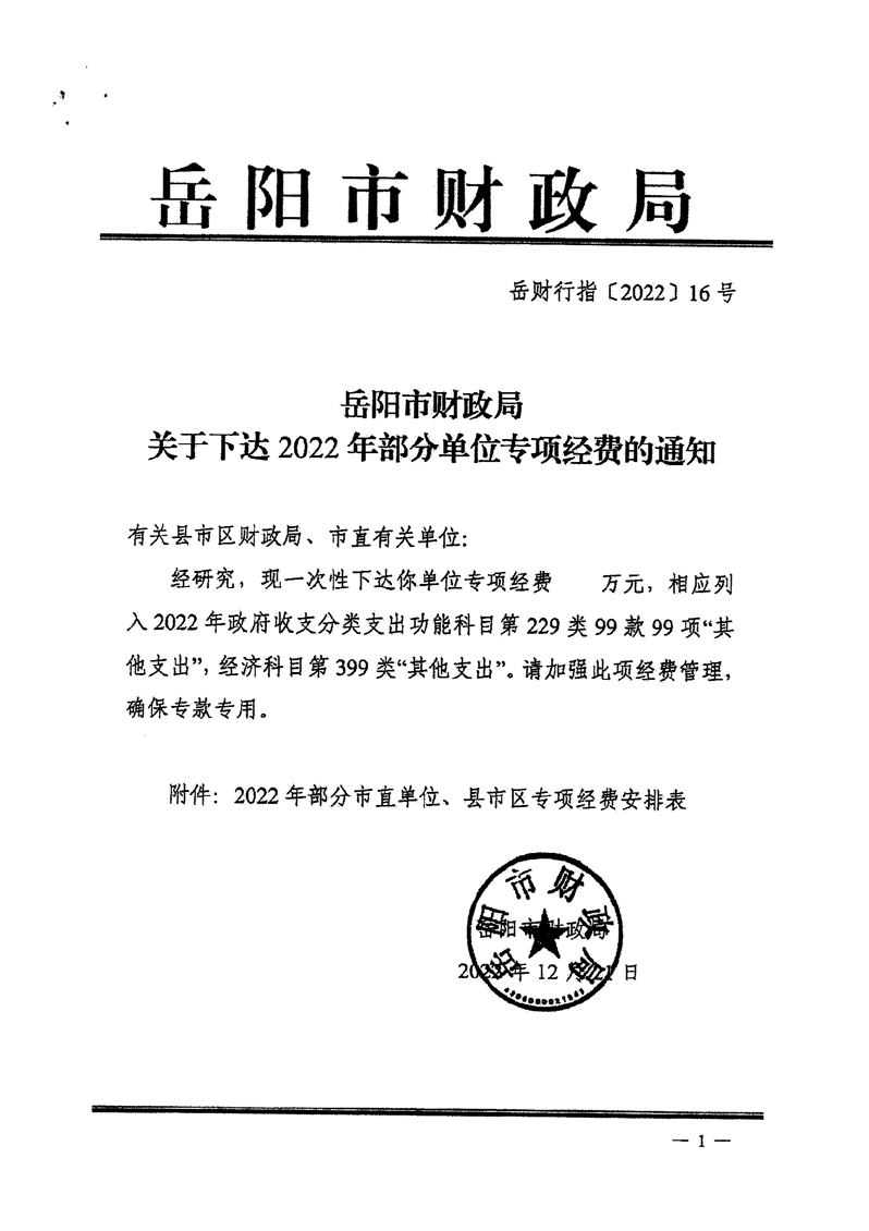 岳阳市财政局关于下达2022年部分单位专项经费的通知