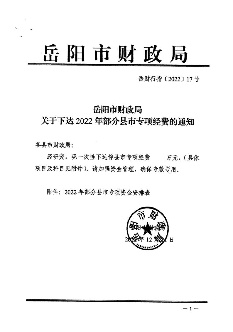 岳阳市财政局关于下达2022年部分县市专项经费的通知