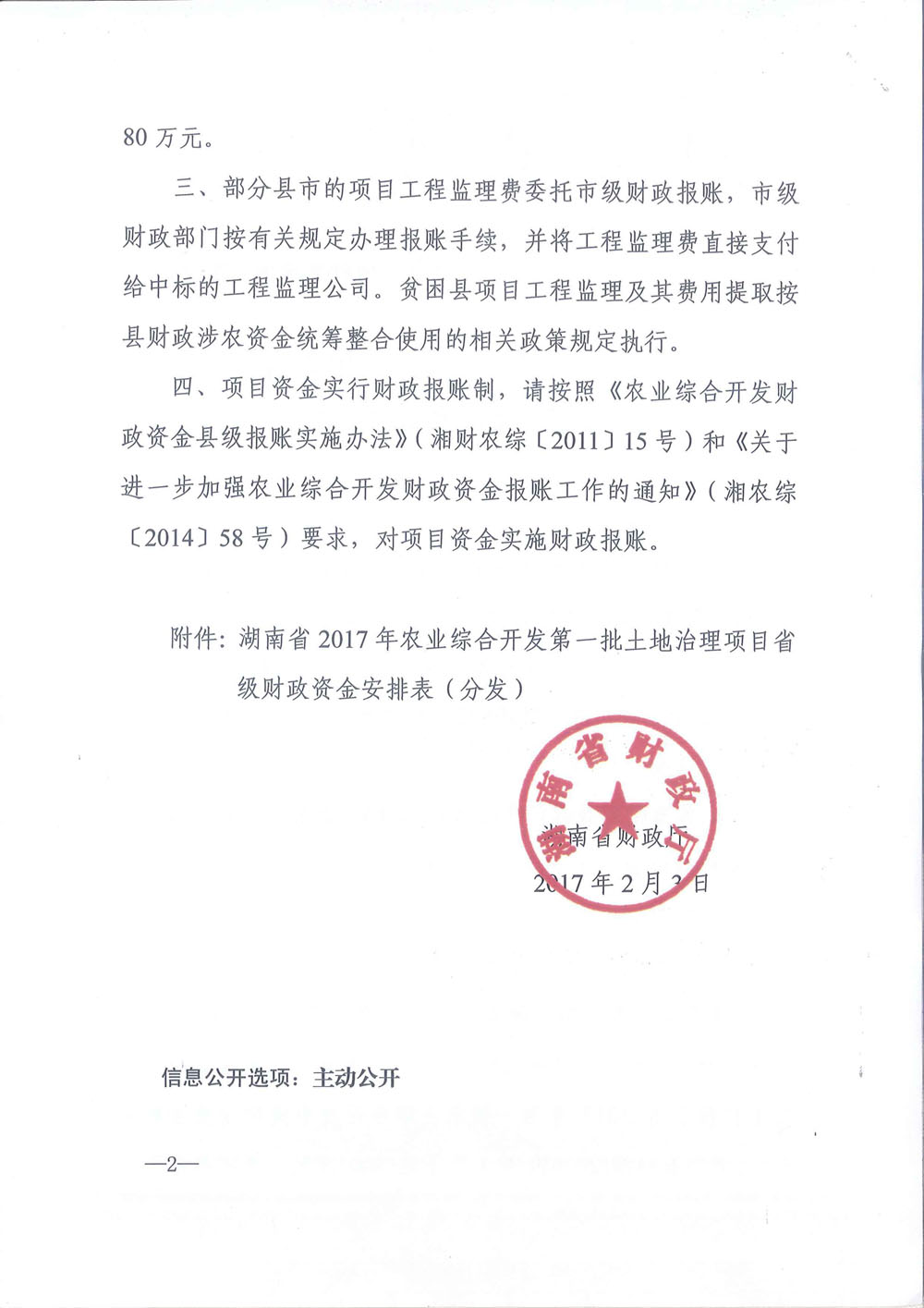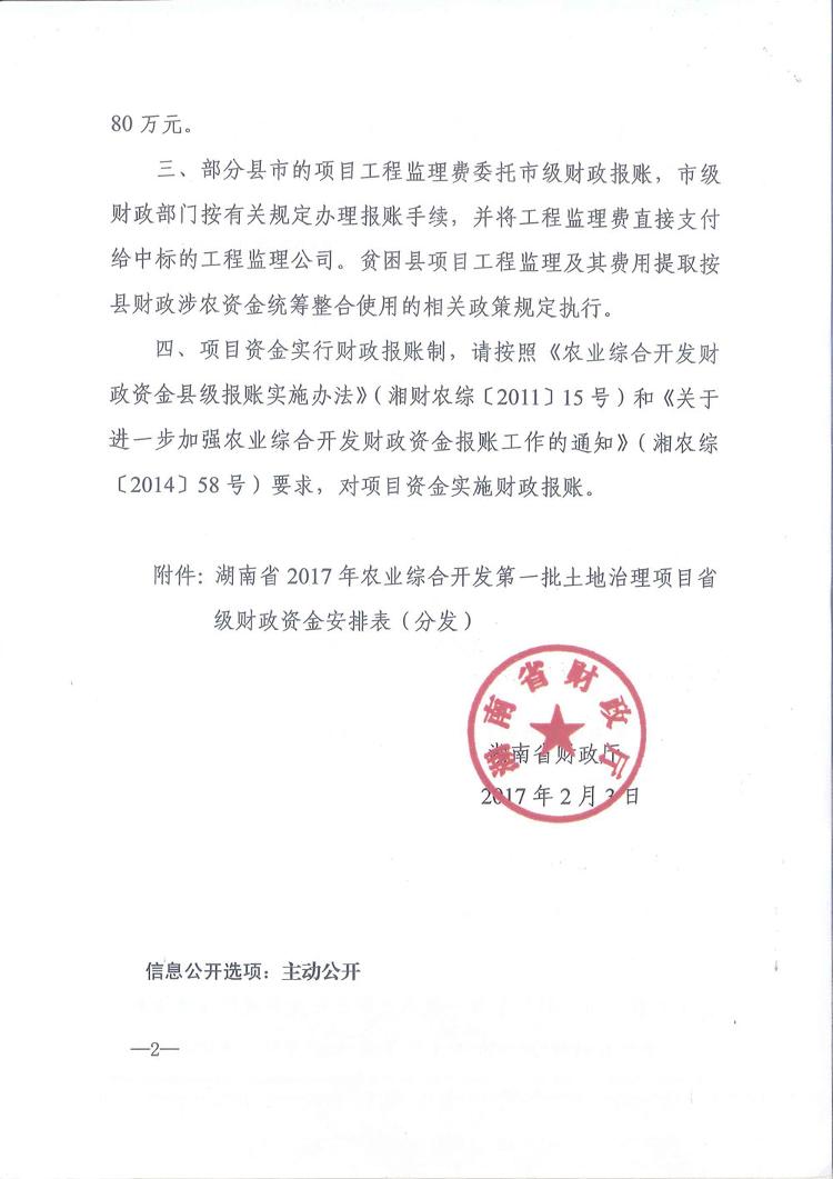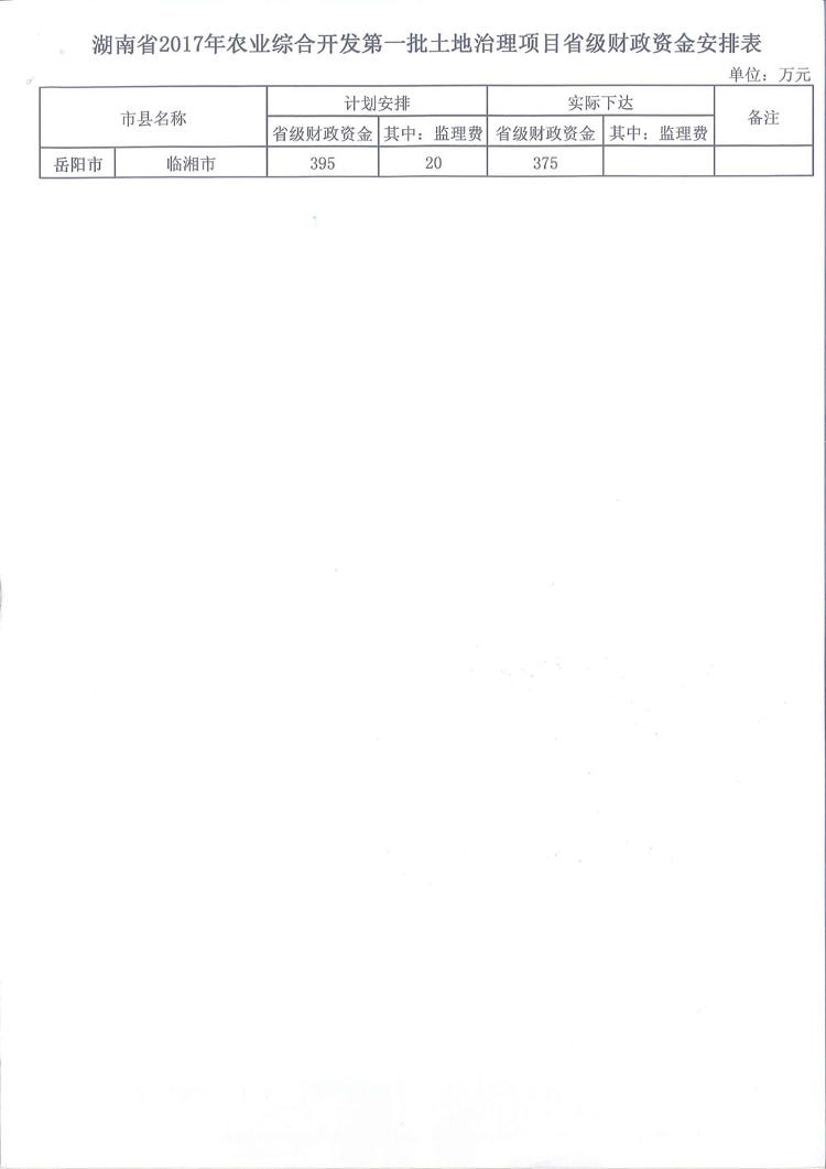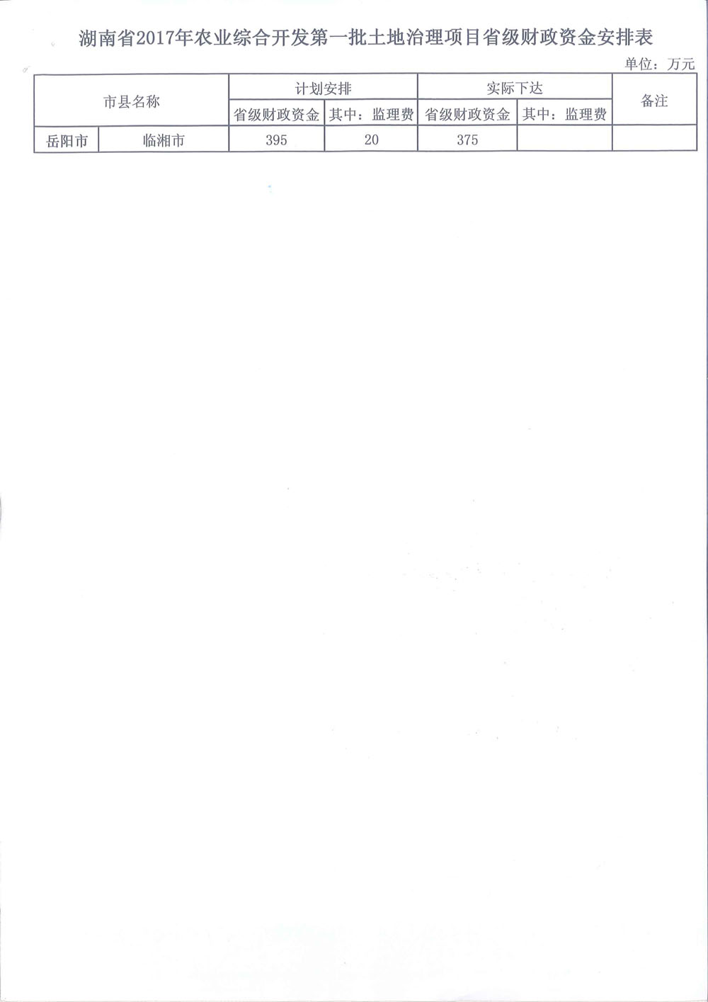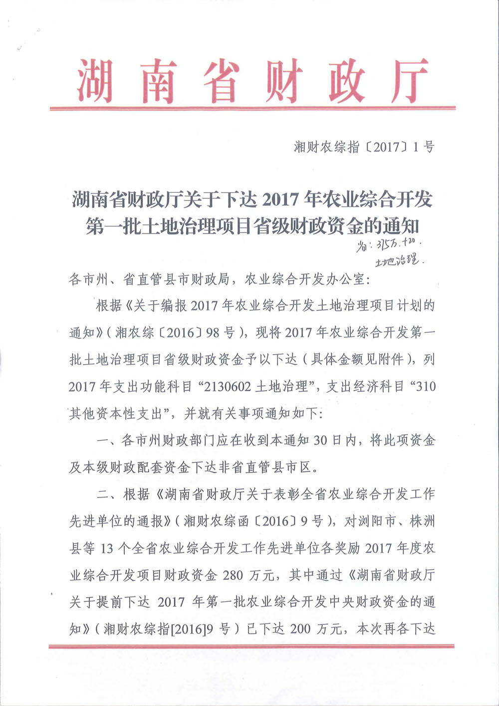 湖南省财政厅关于下达2017年农业综合开发第一批土地治理项目省级财政资金的通知