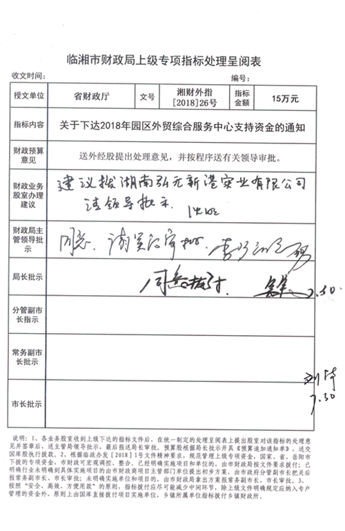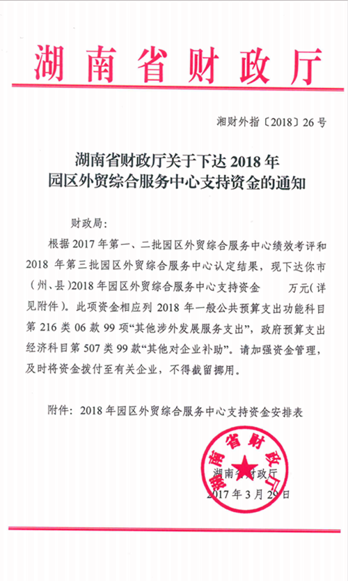 湖南省财政厅关于下达2018年园区外贸综合服务中心支持资金的通知