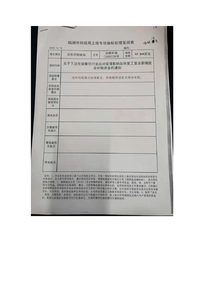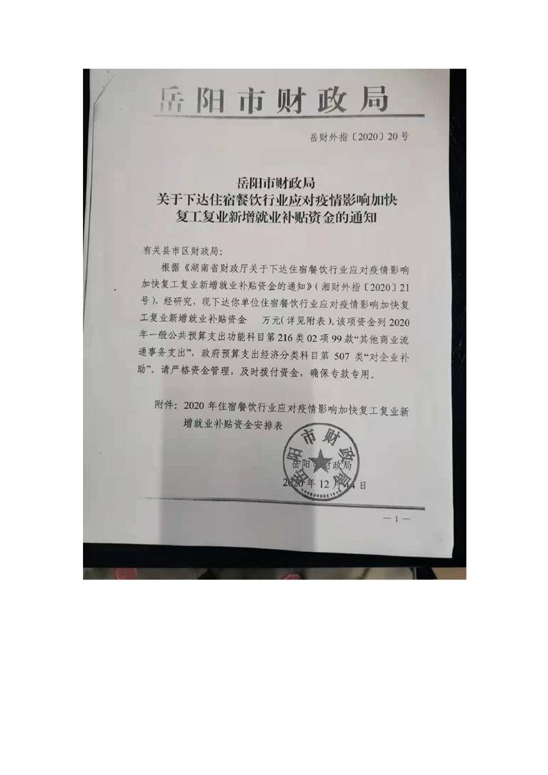 关于下达住宿餐饮行业应对疫情影响加快复工复业新增就业补贴资金的通知