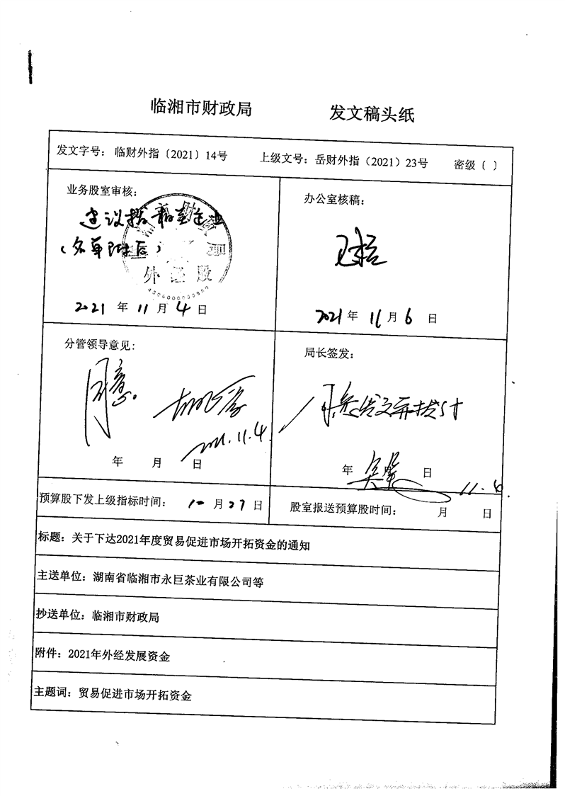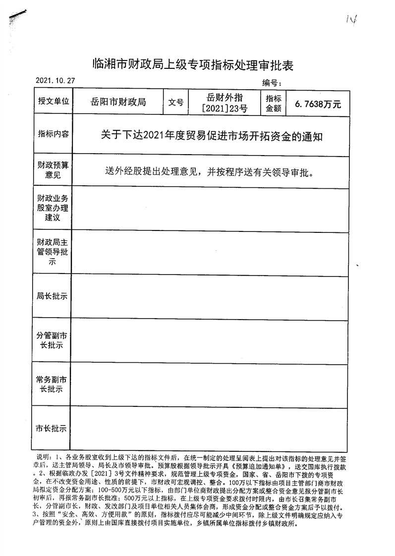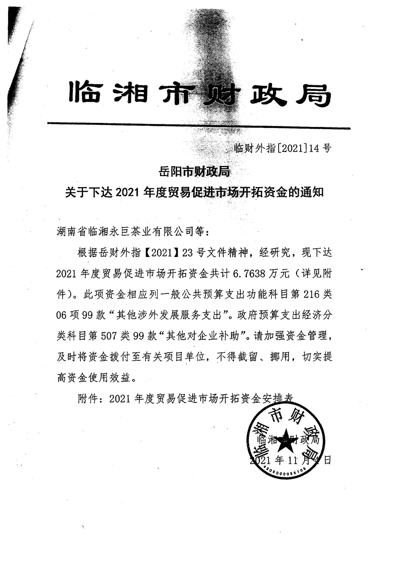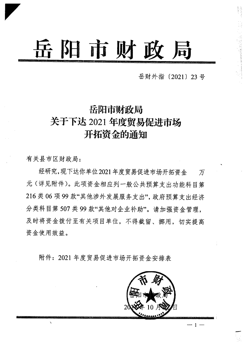 关于下达2021年度贸易促进市场开拓资金的通知