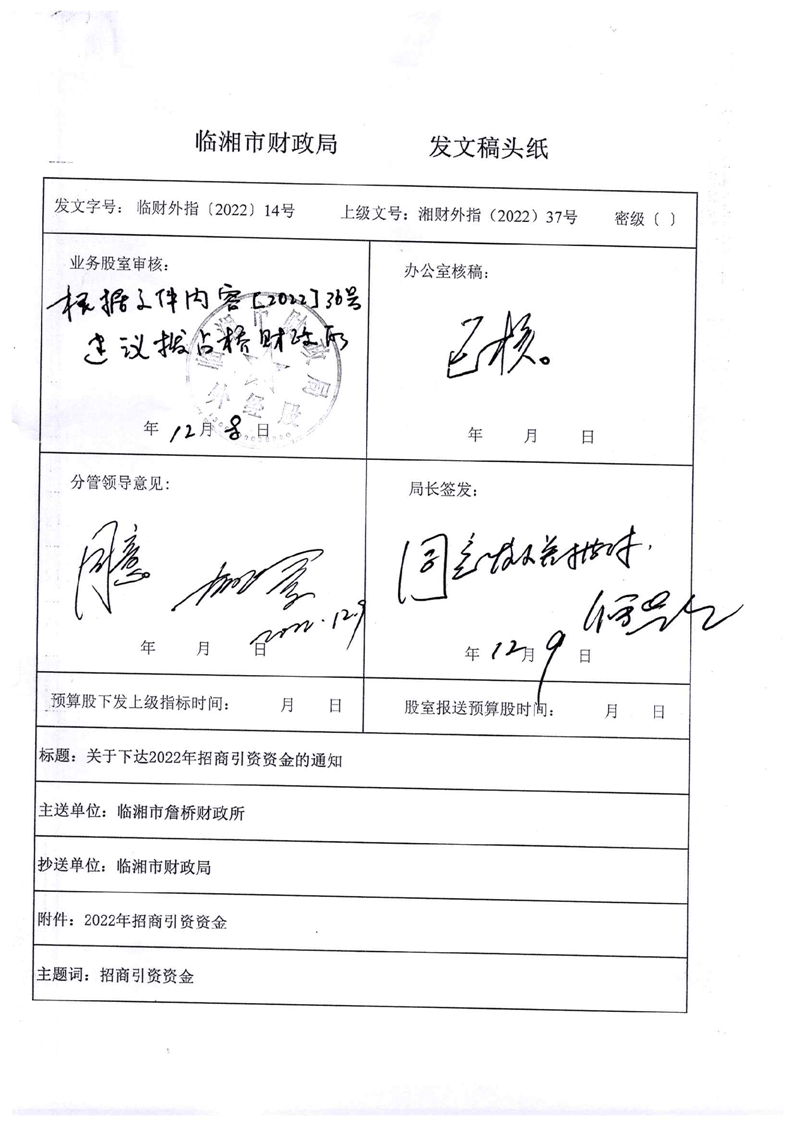 湖南省财政厅关于下达2022年招商引资资金的通知