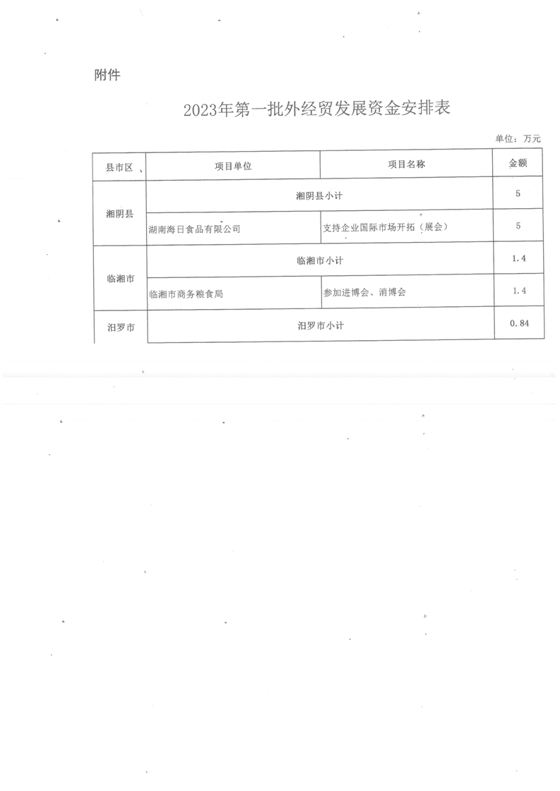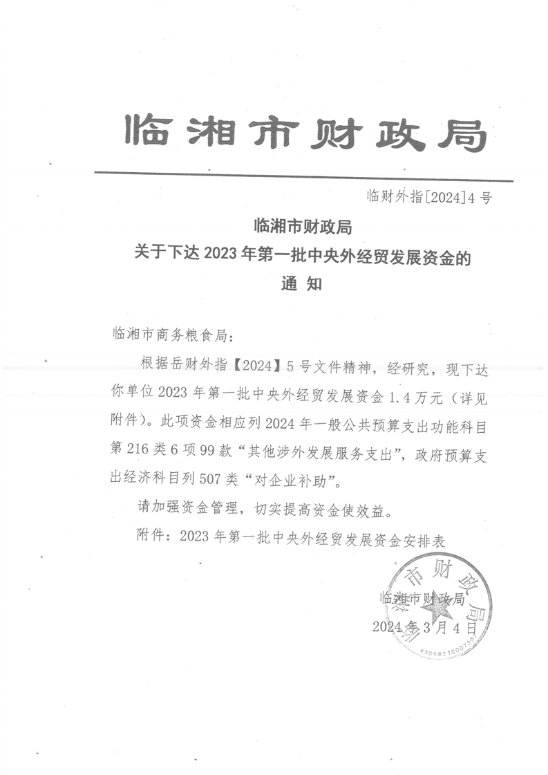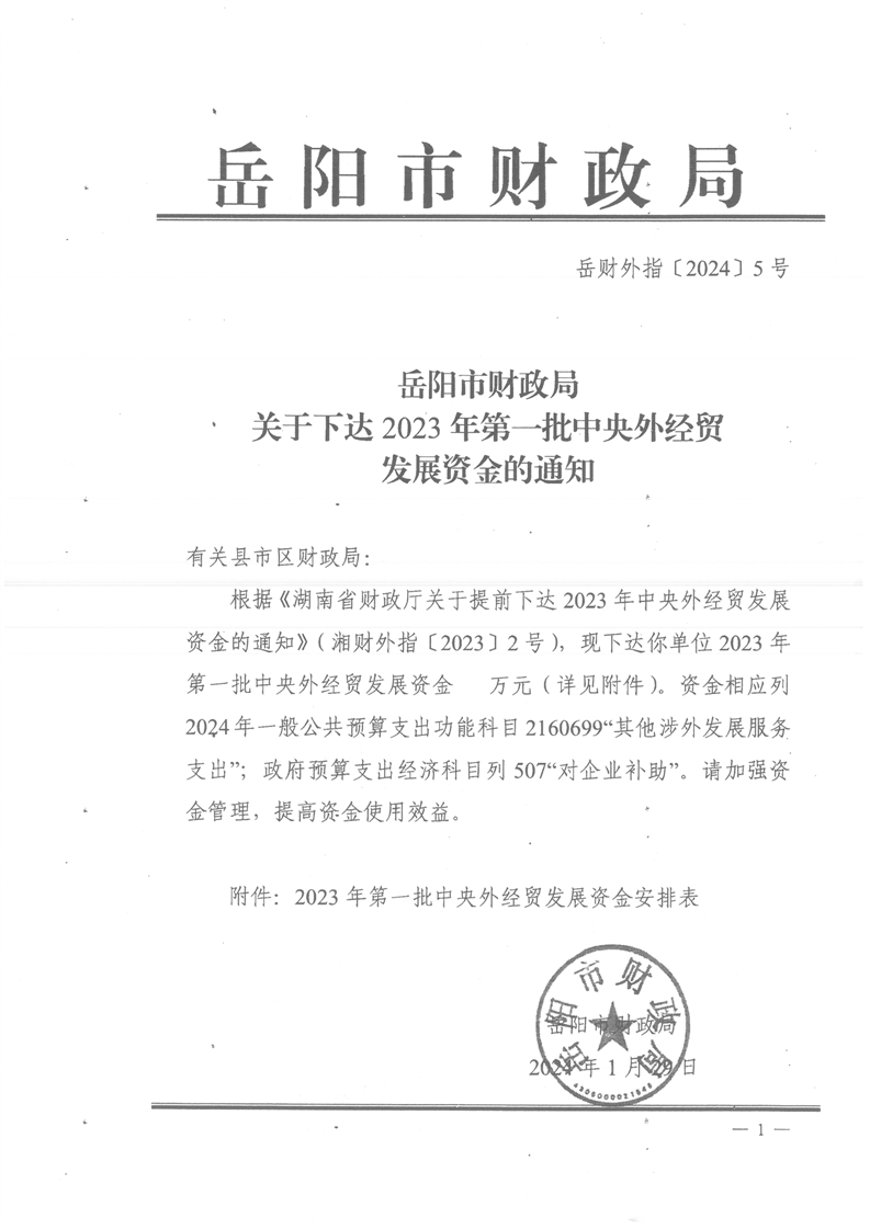 岳阳市财政局关于下达2023年第一批中央外经贸发展资金的通知(岳财外指〔2024〕5号)