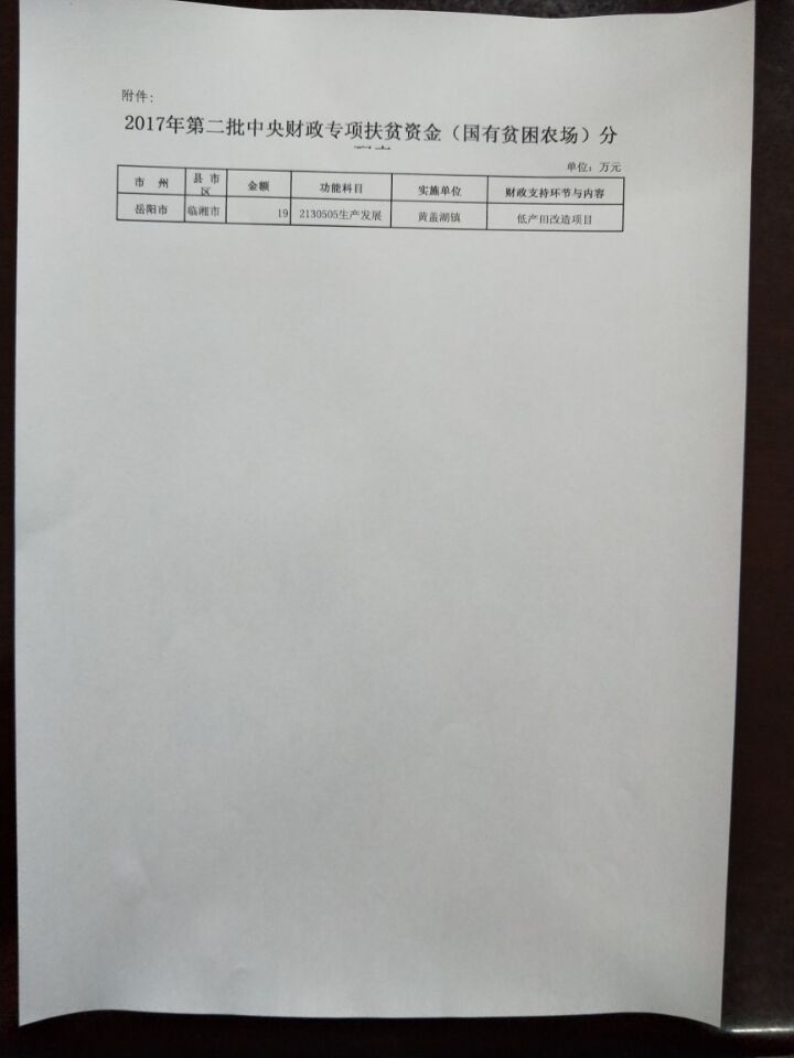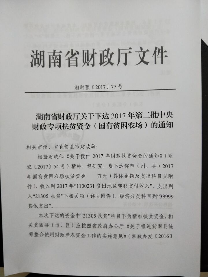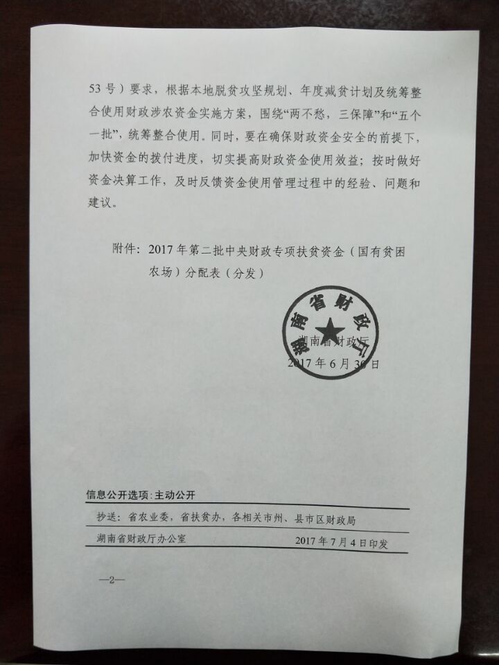 湖南省财政厅关于下达2017年第二批中央财政专项扶贫资金(国有贫困农场)的通知