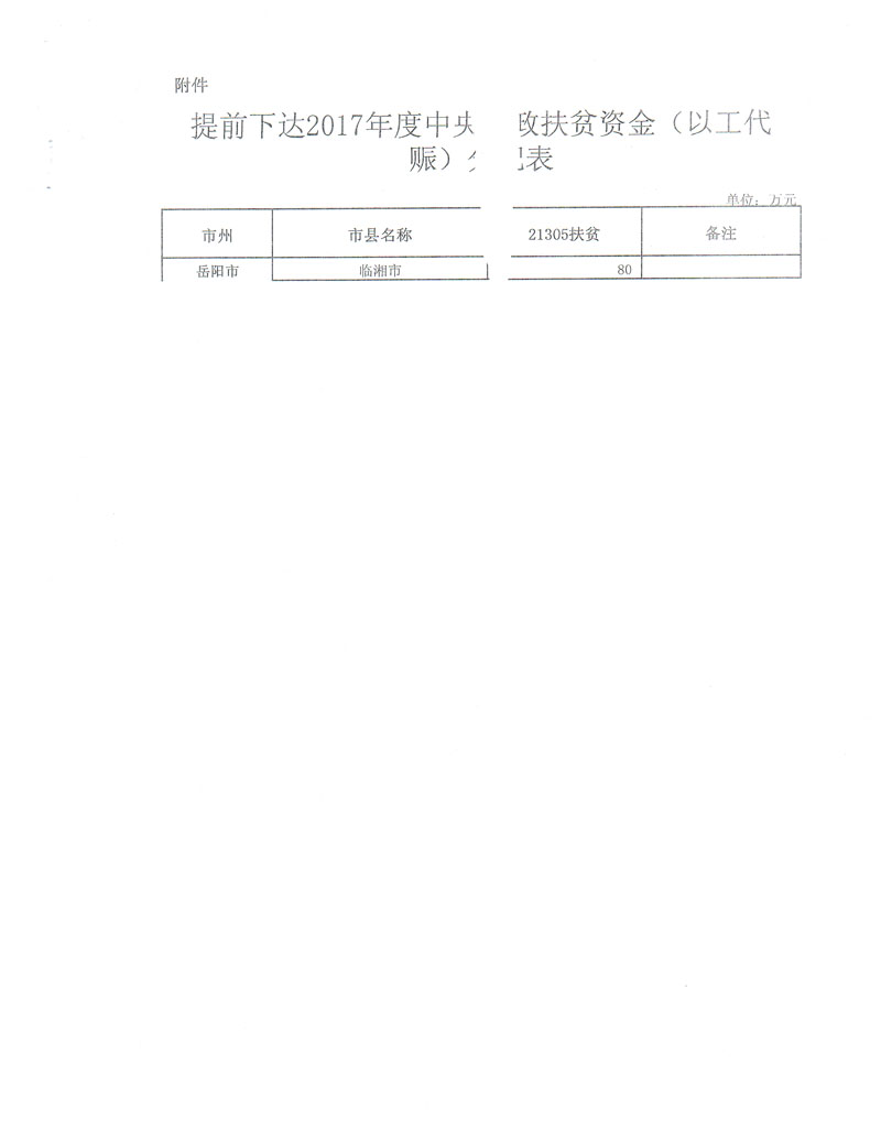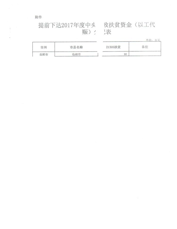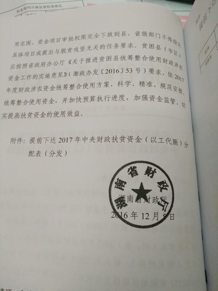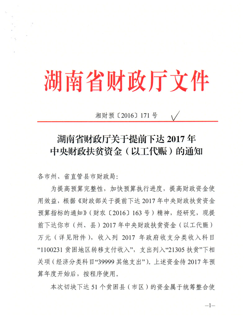 湖南省财政厅关于提前下达2017年中央财政扶贫资金(以工代赈)的通知