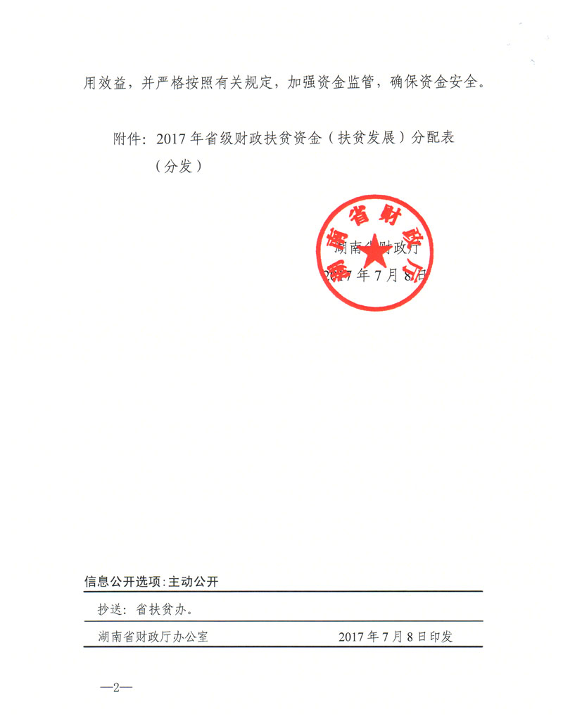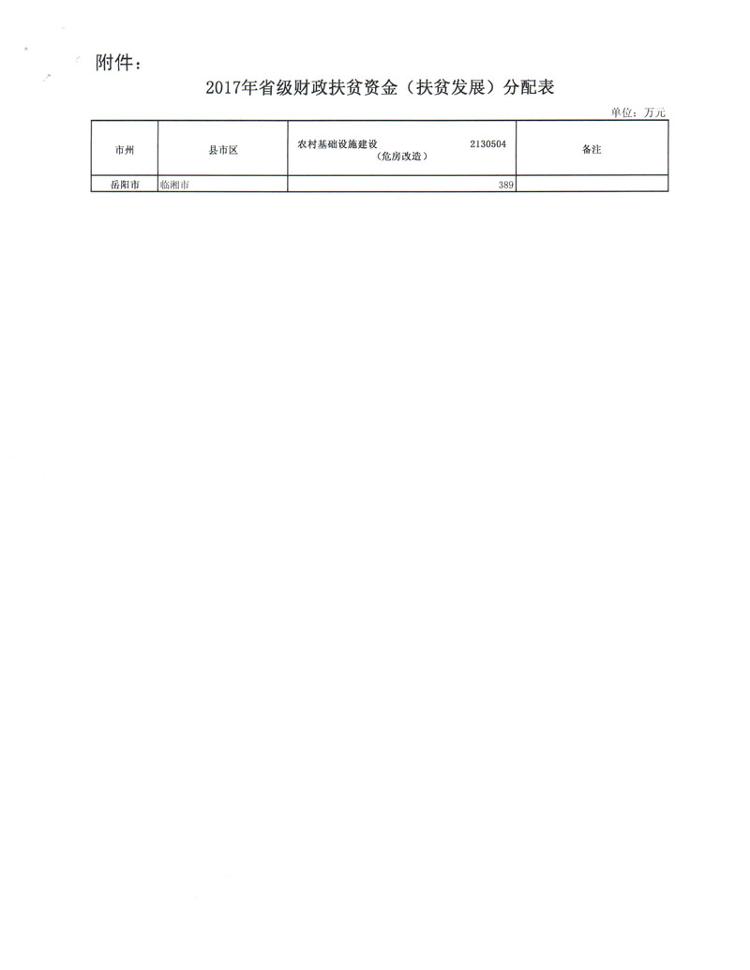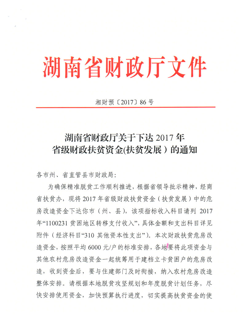湖南省财政厅关于下达2017年省级财政扶贫(扶贫发展)的通知2
