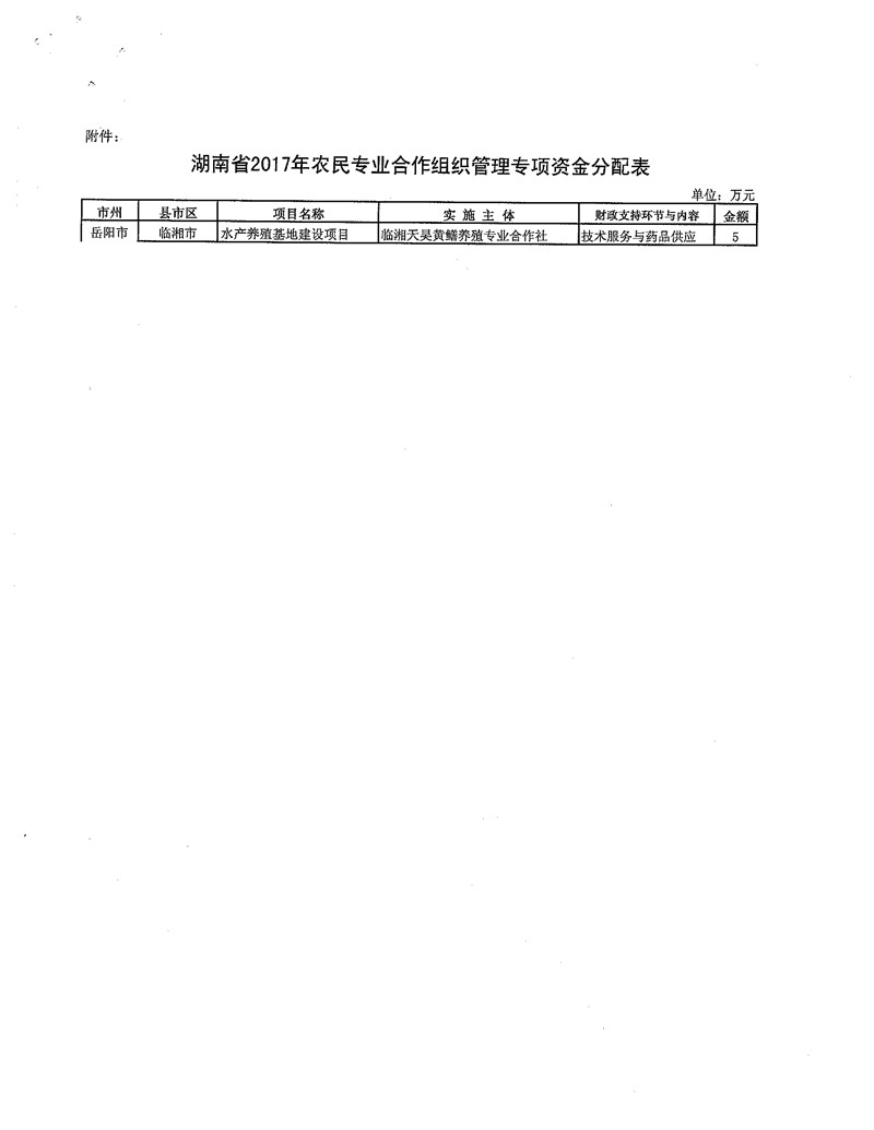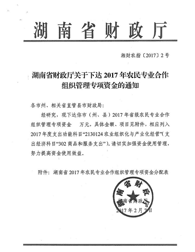 湖南省财政厅关于下达2017年农民专业合作组织管理专项资金的通知