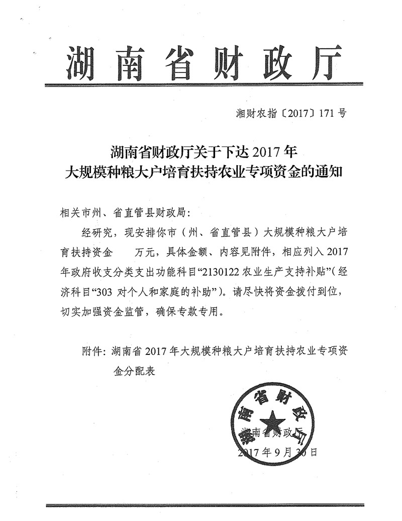 湖南省财政厅关于下达2017年大规模种粮大户培育扶持农业专项资金的通知