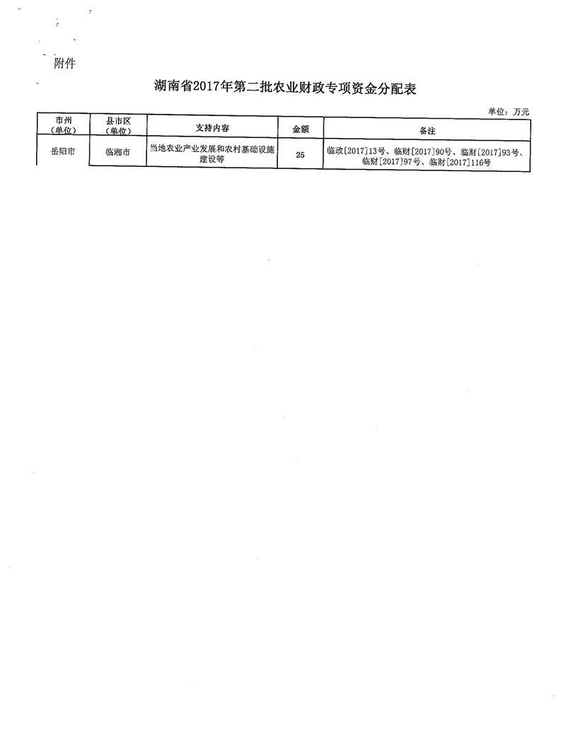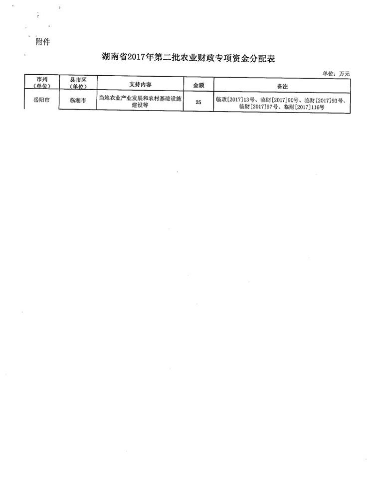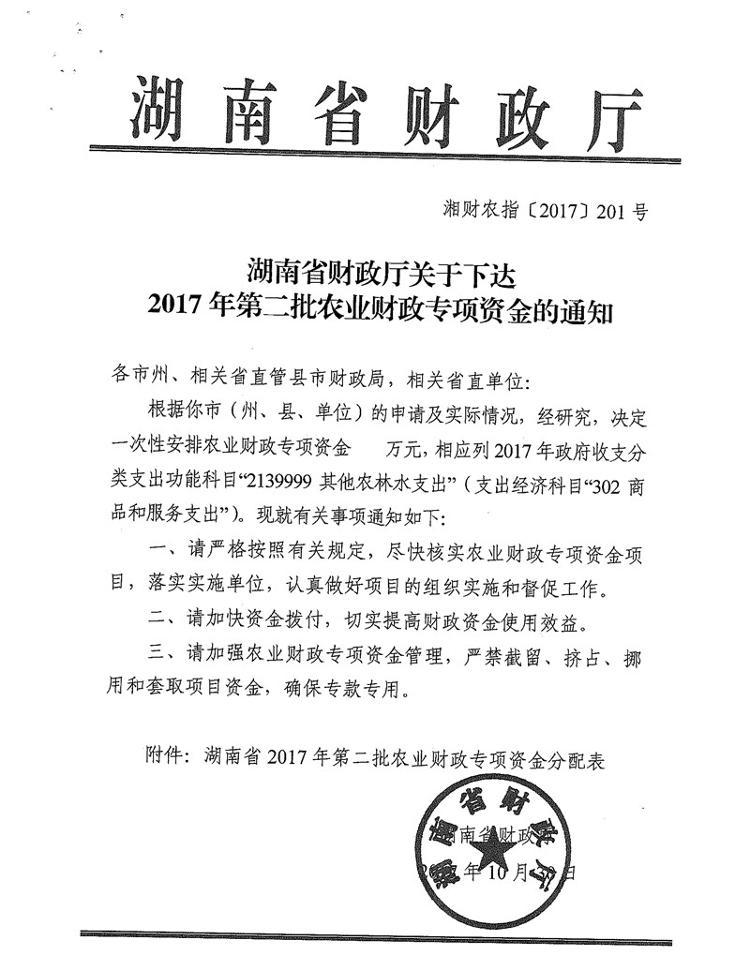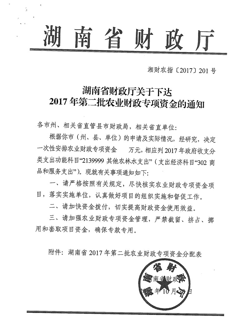湖南省财政厅关于下达2017年第二批农业财政专项资金的通知