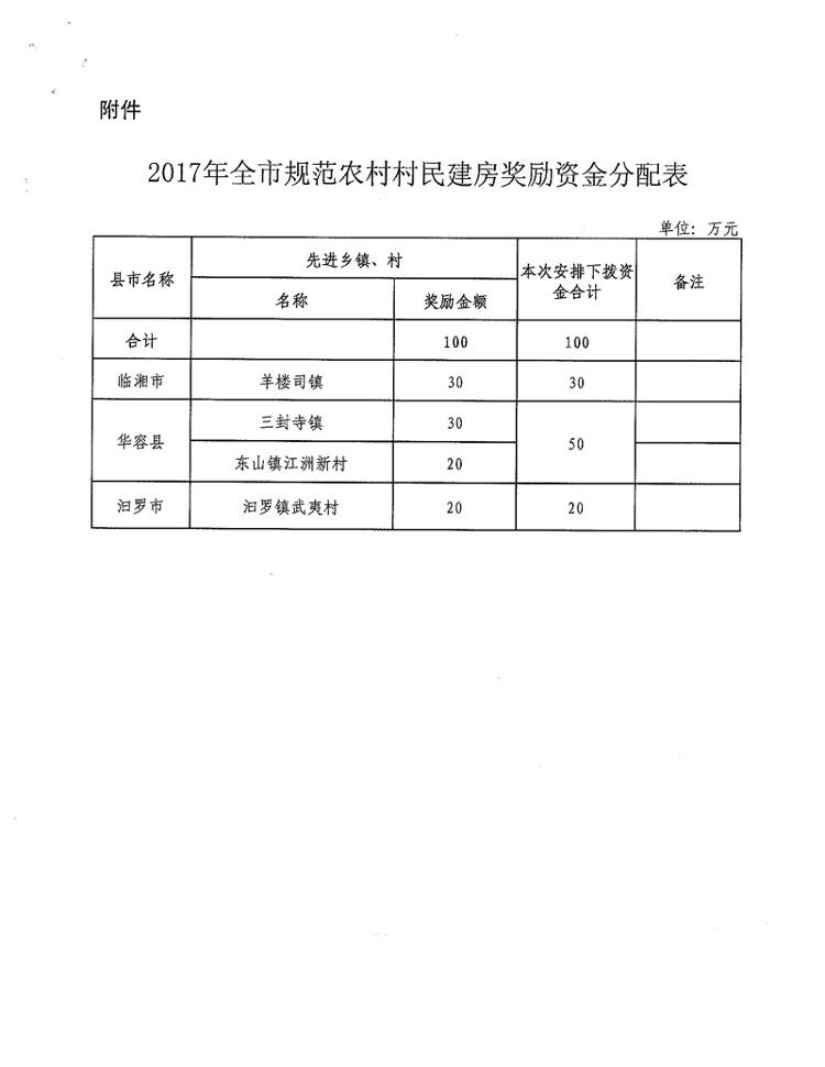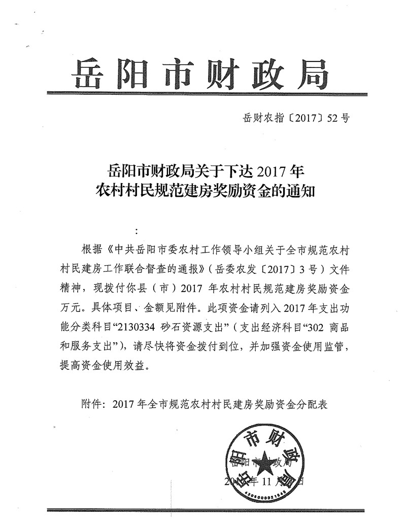 岳阳市财政局关于下达2017年农村村民规范建房奖励资金的通知