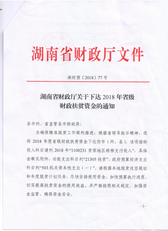 湖南省财政厅关于下达2018年省级财政扶贫资金的通知
