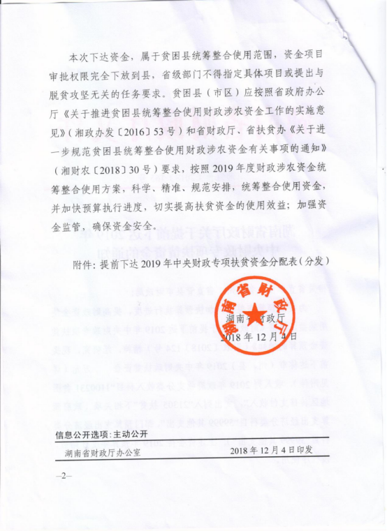 湖南省财政厅关于提前下达2019年中央财政专项扶贫资金的通知