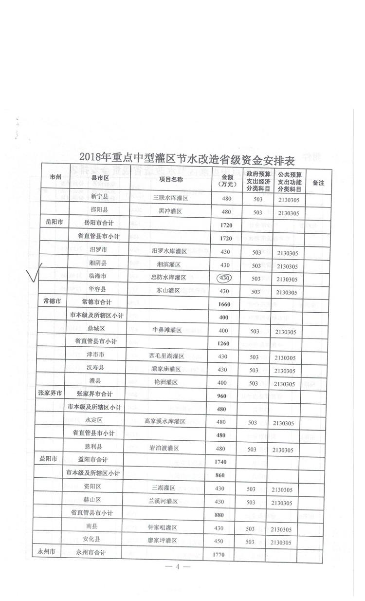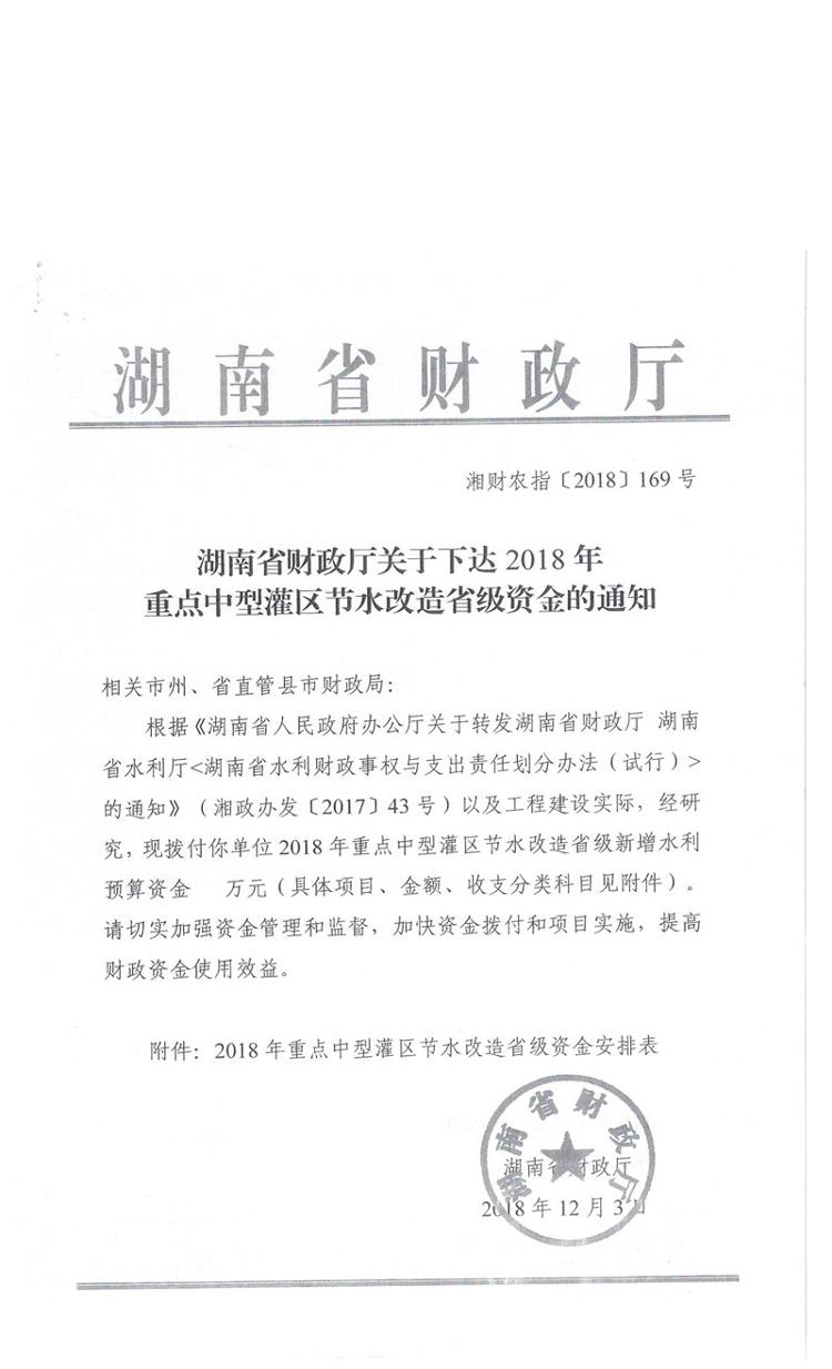 湖南省财政厅关于下达2018年重点中型灌区节水改造省级资金的通知