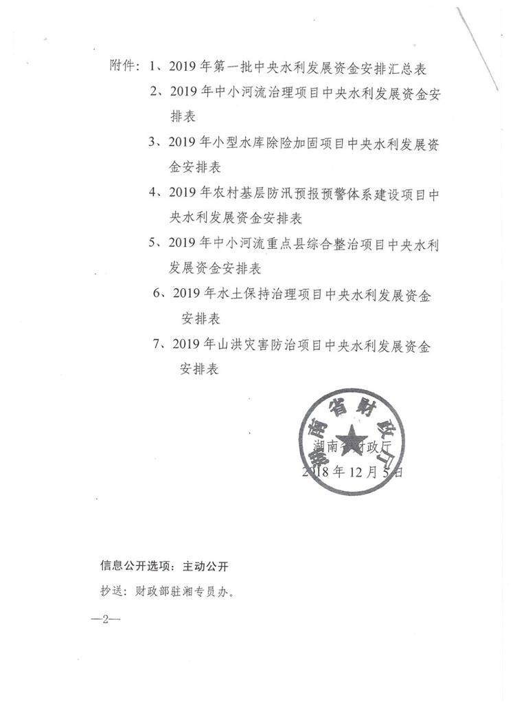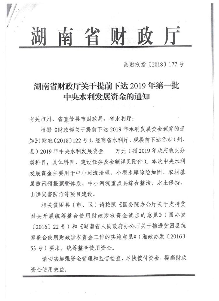 湖南省财政厅关于提前下达2019年第一批中央水利发展资金的通知