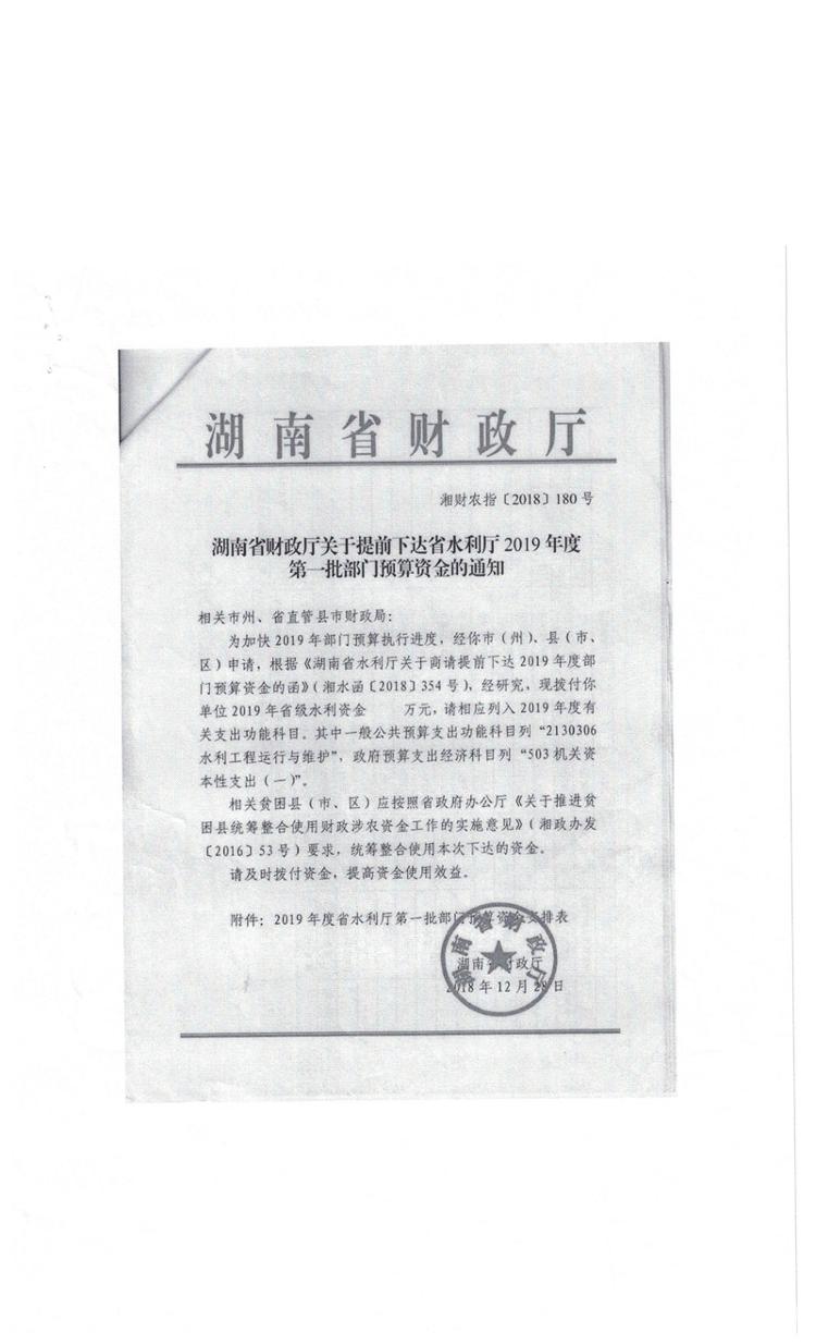 湖南省财政厅关于提前下达省水利厅2019年第一批部门预算资金的通知