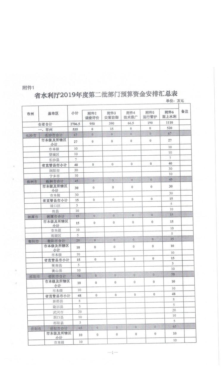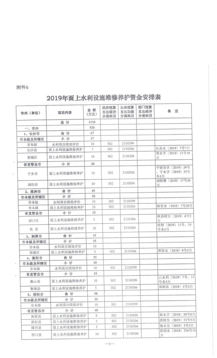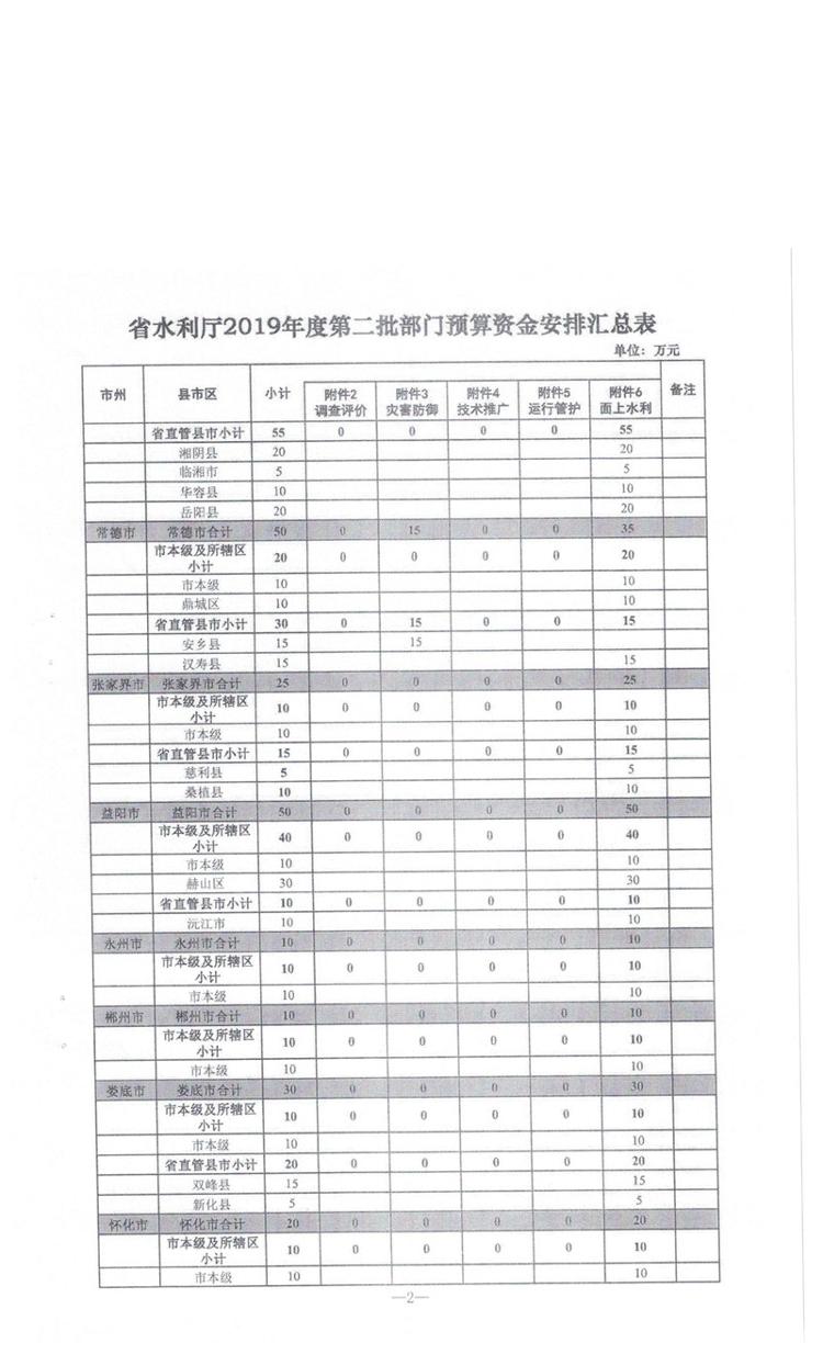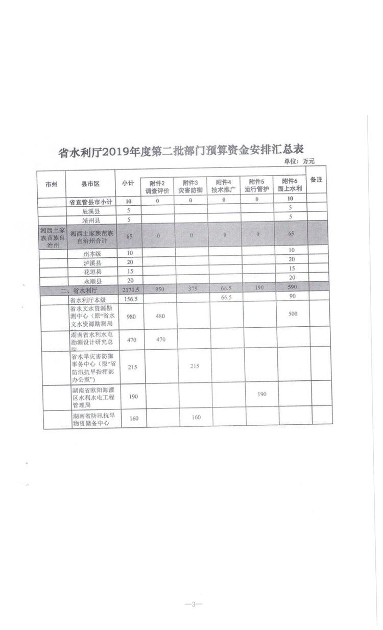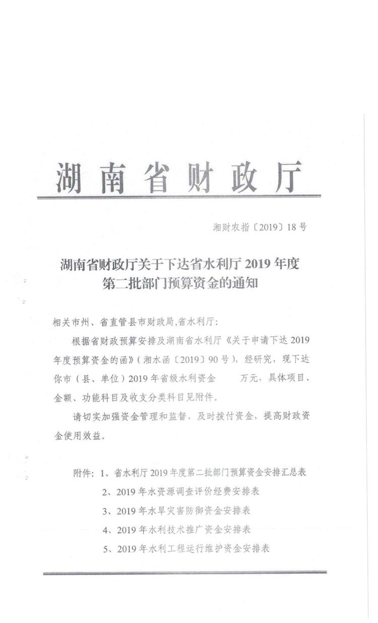 湖南省财政厅关于下达省水利厅2019年第二批部门预算资金的通知