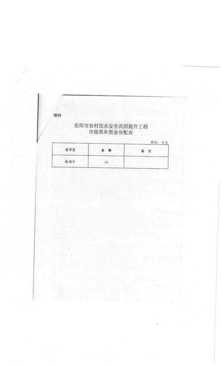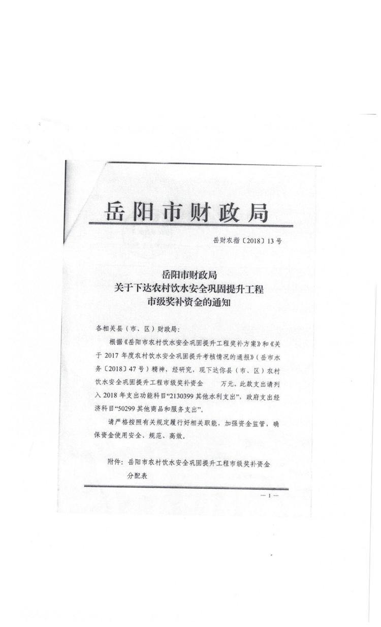 岳阳市财政局关于下达农村饮水安全巩固提升工程市级将奖补资金的通知