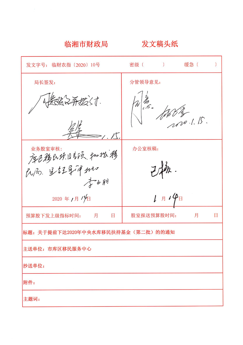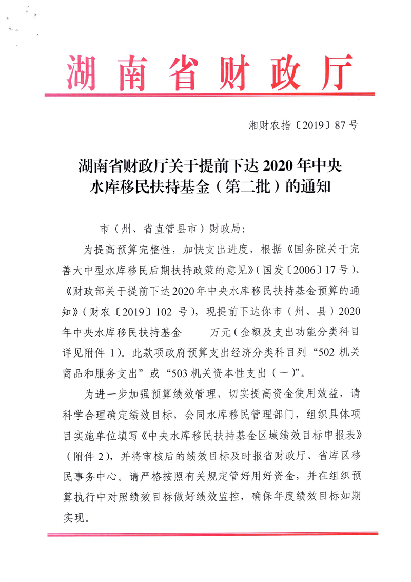 关于提前下达2020年中央水库移民扶持基金(第二批)的通知