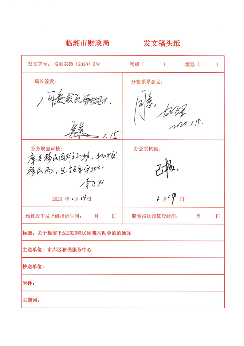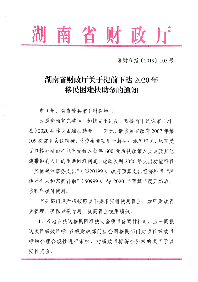 关于提前下达2020年移民困难扶助金的通知