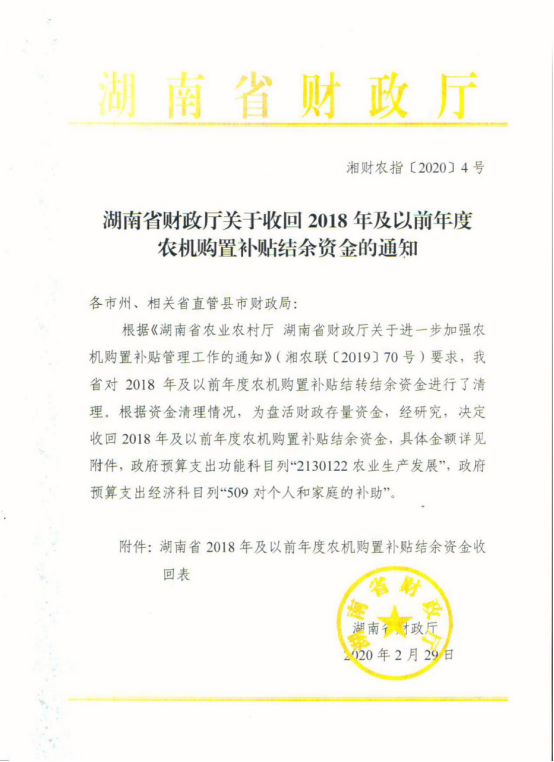 湖南省财政厅收回2018年及以前年度农机购置补贴结余资金的通知