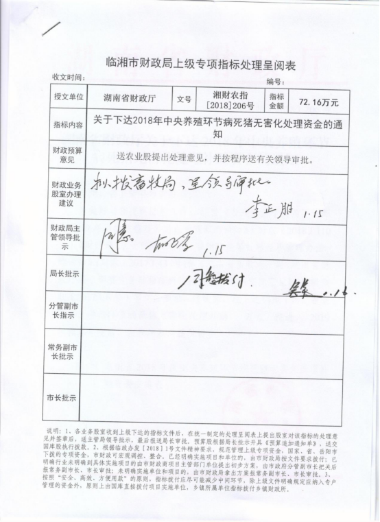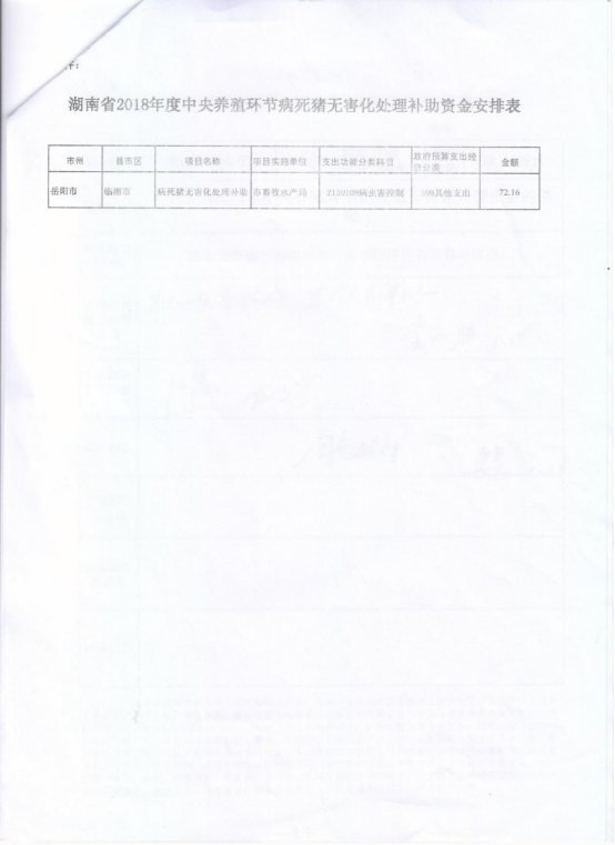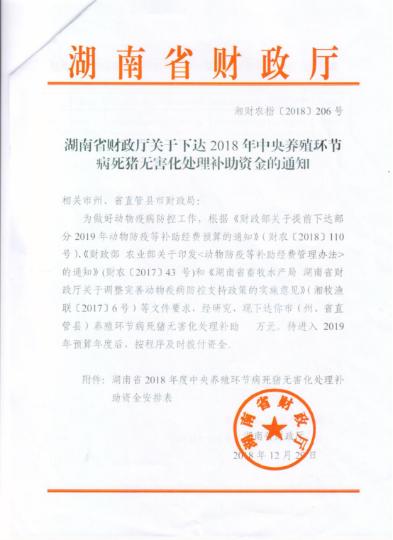 湖南省财政厅关于下达2018年中央养殖环节病死猪无害化处理补助资金的通知