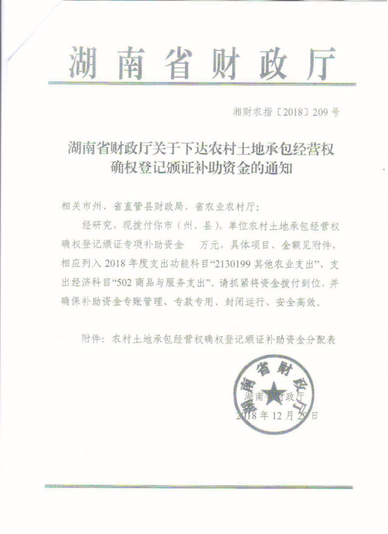 关于下达农村土地承包经营权确权登记颁证补助资金的通知