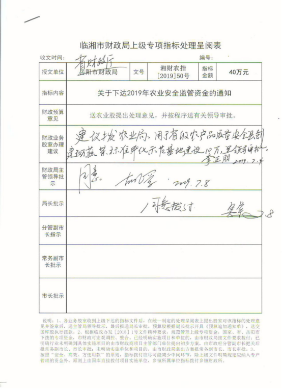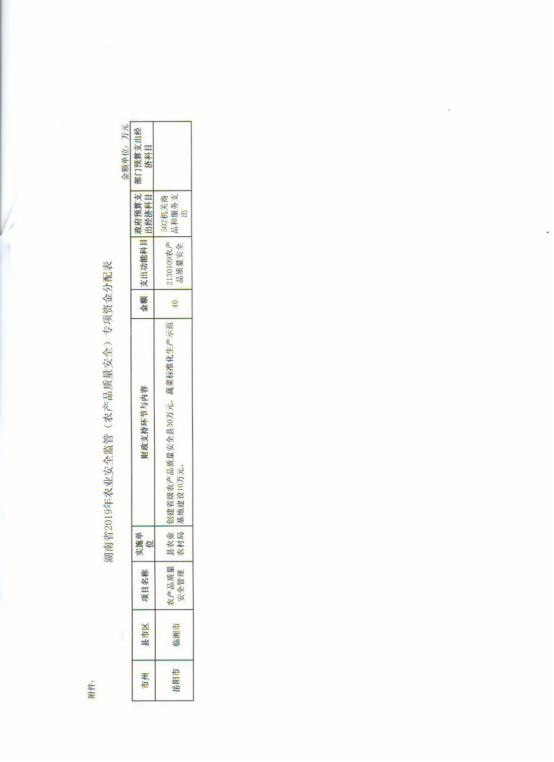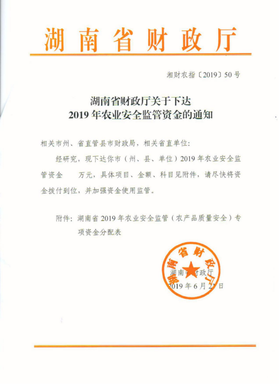 湖南省财政厅关于下达2019年农业安全监管资金的通知