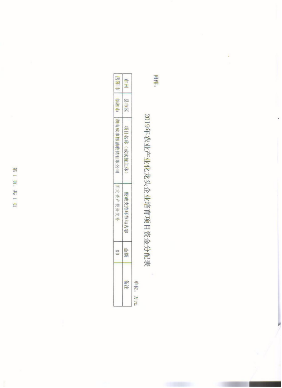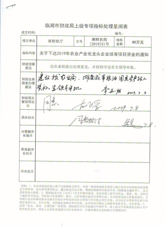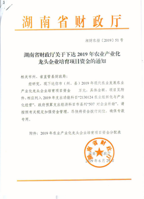 湖南省财政厅关于下达2019年农业产业化龙头企业培育项目资金的通知