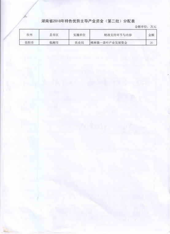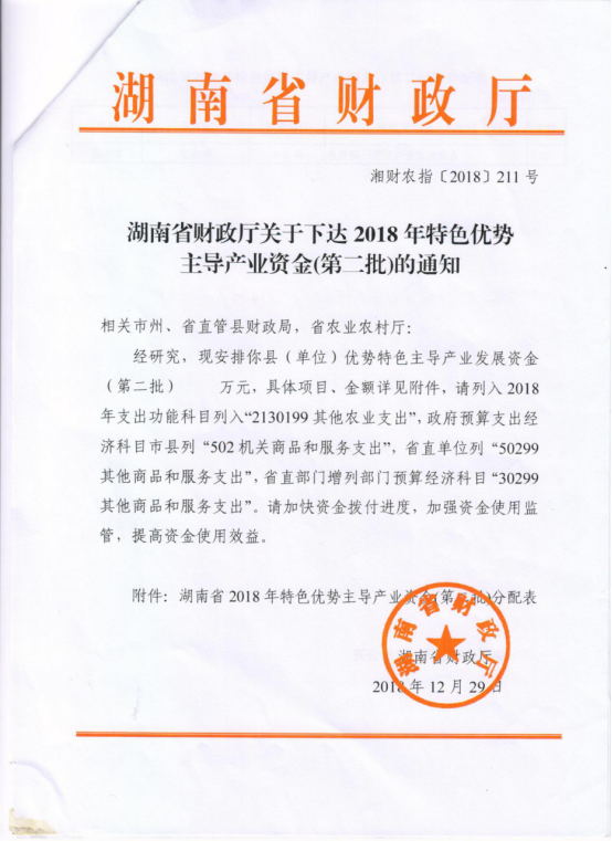 湖南省财政厅关于下达2018年特色优势主导产业资金(第二批)的通知