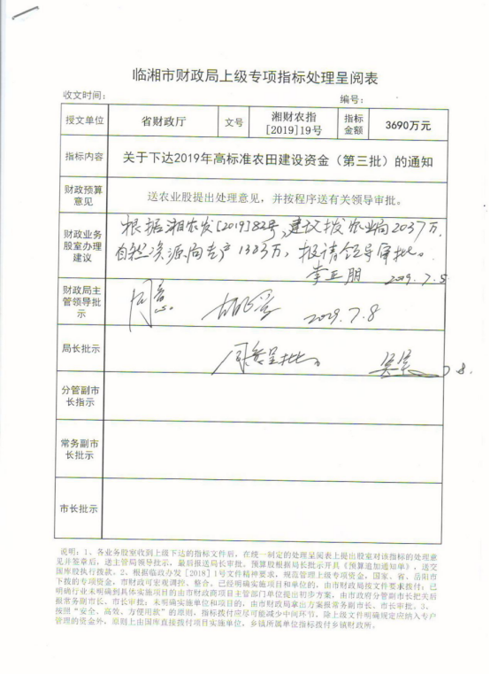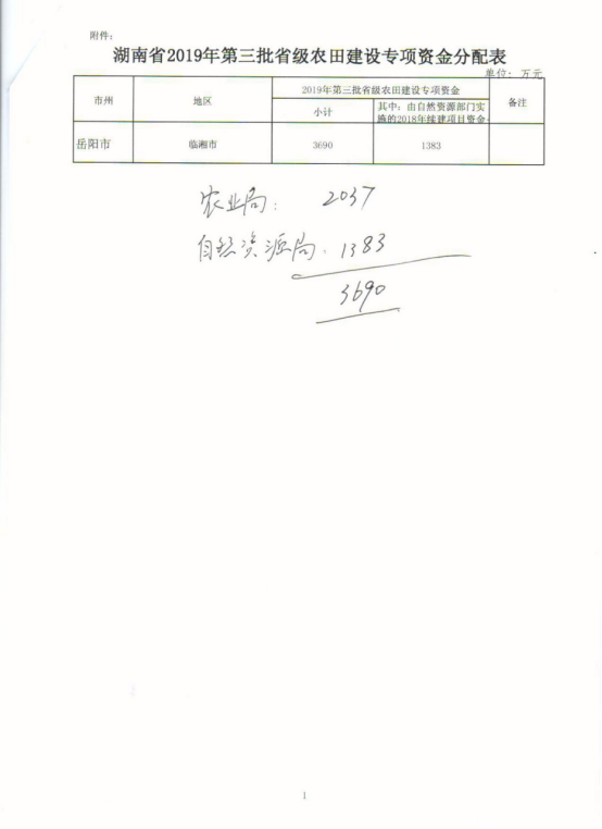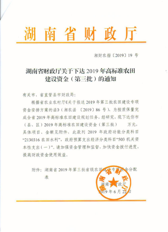 湖南省财政厅关于下达2019年高标准农田建设资金(第三批)的通知