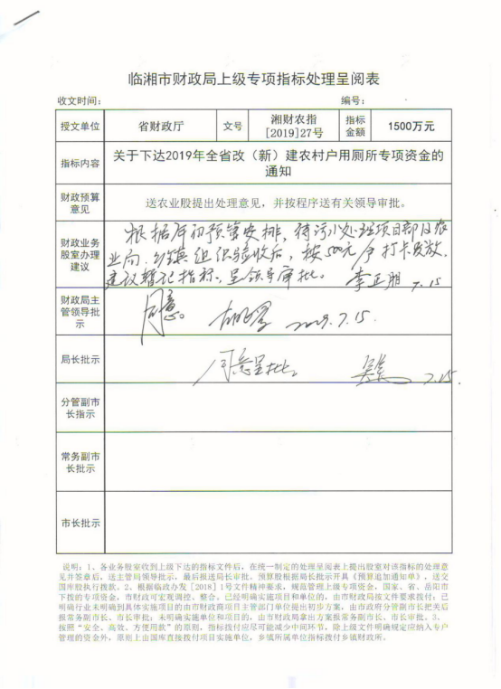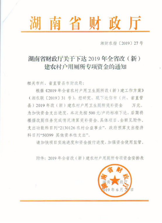 湖南省财政厅关于下达2019年全省改建农村户用厕所专项资金的通知